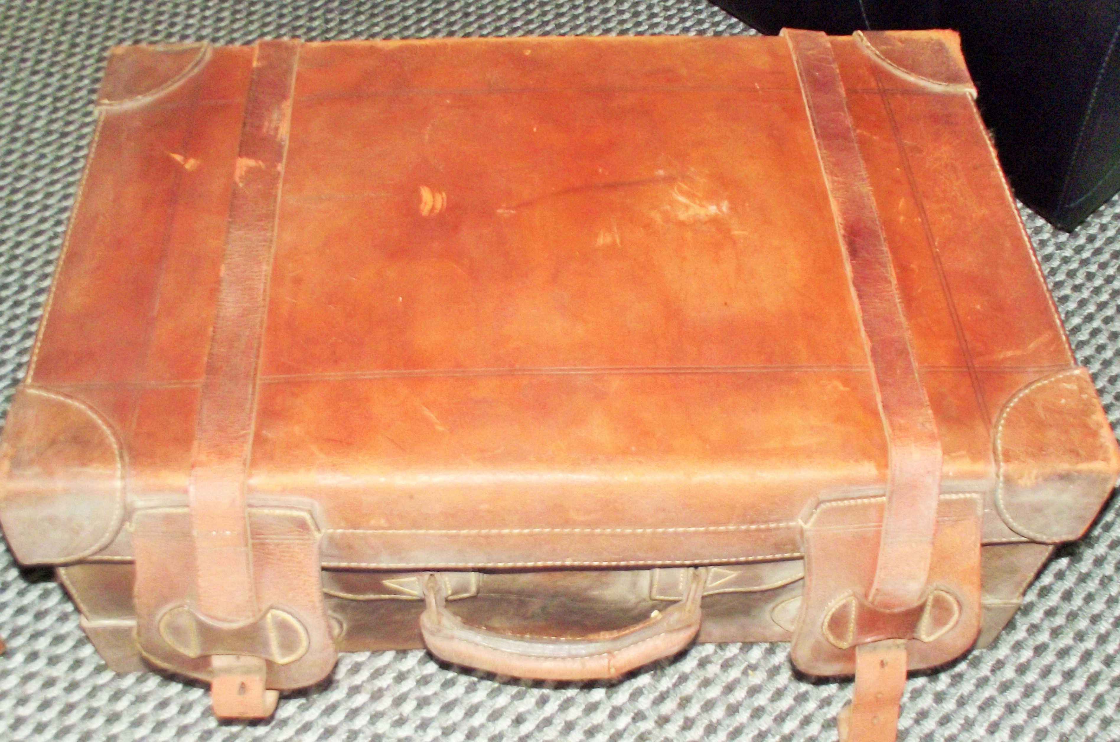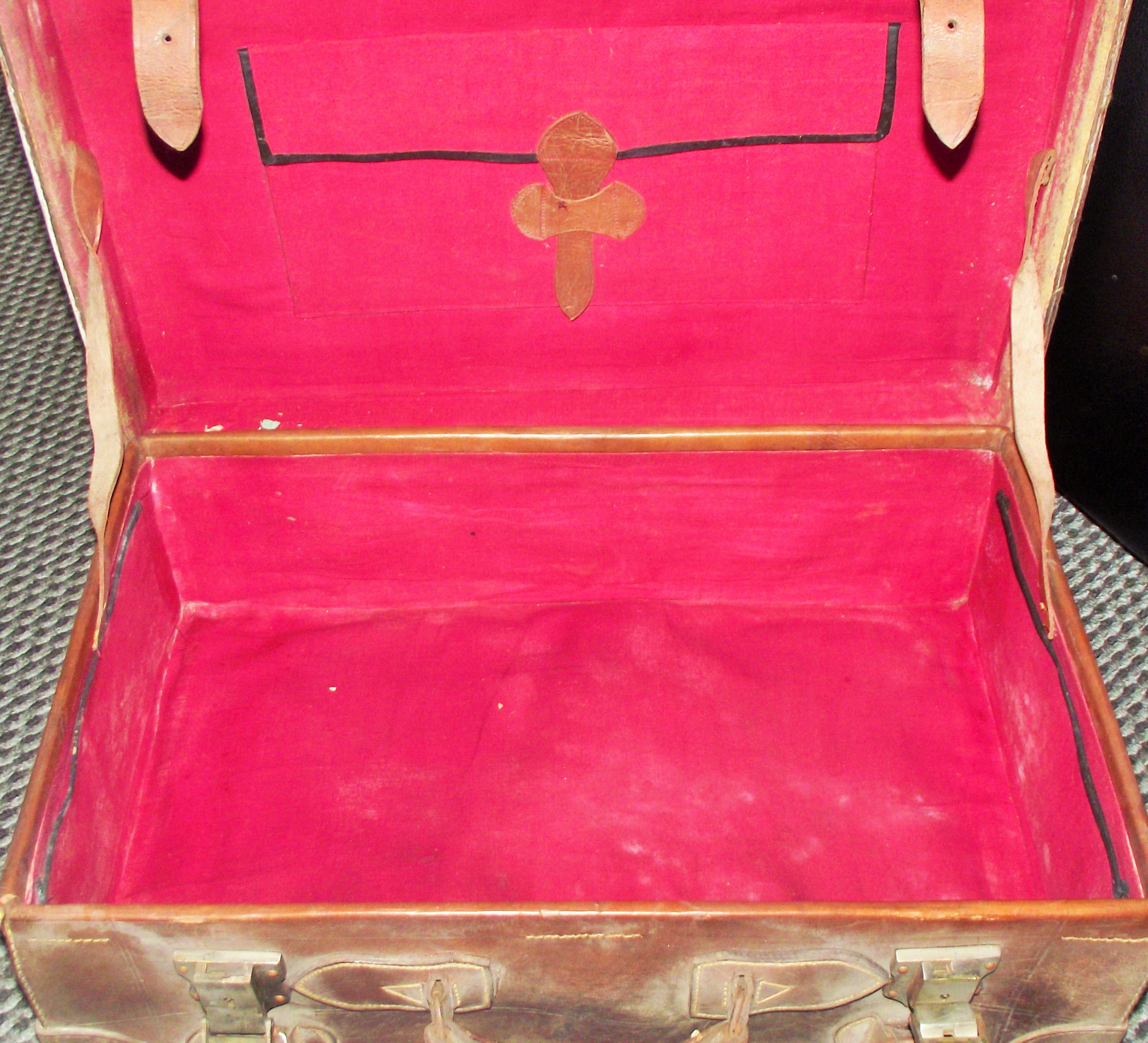 1930s Leather suitcase with original leather straps clip lock catches( makers mark to locks Mall Seth Bombay )