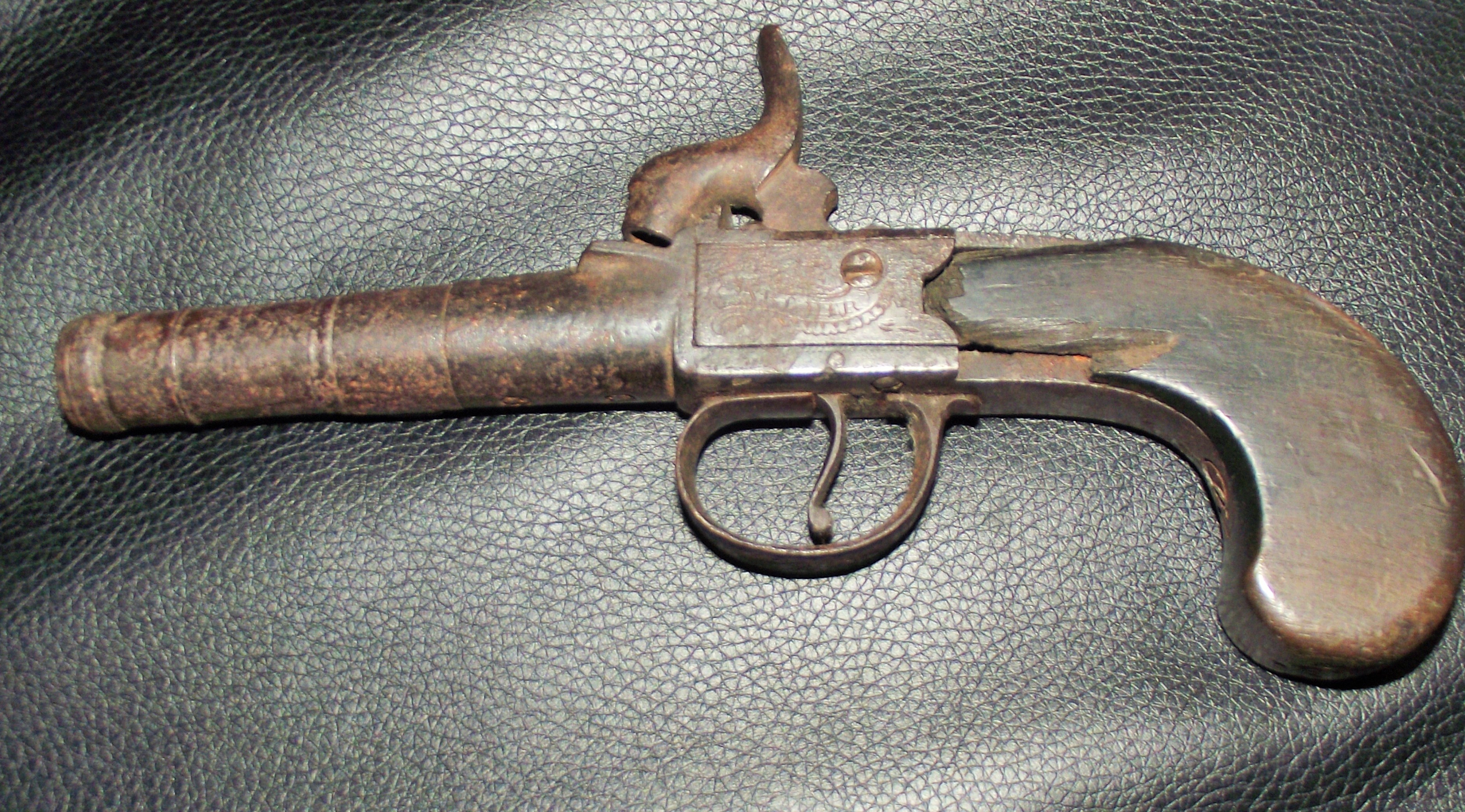 Mid 19th Century period London muzzle loading single barrel percussion pocket pistol circa 1850 7cm turn-off barrel, foliate engraved side-plates and trigger guard with slab walnut stock, with proof marks but no gunsmith’s markings, 19cm long overall (damage to one side of stock)