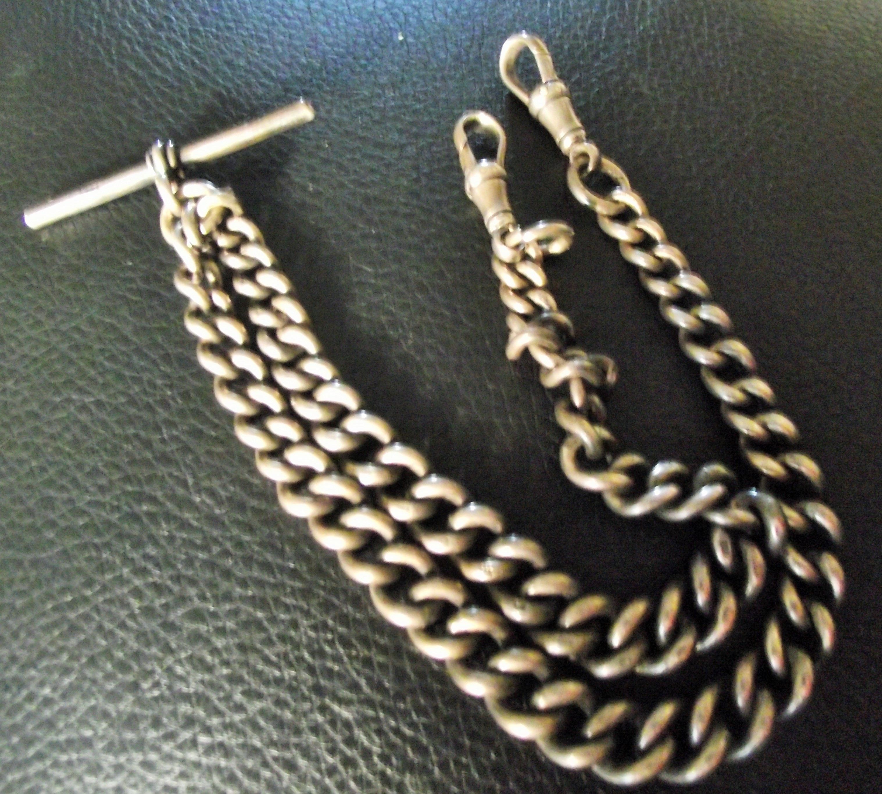 Double albert T bar silver watch chain marked on each link t bar and clasps 55.5g approx