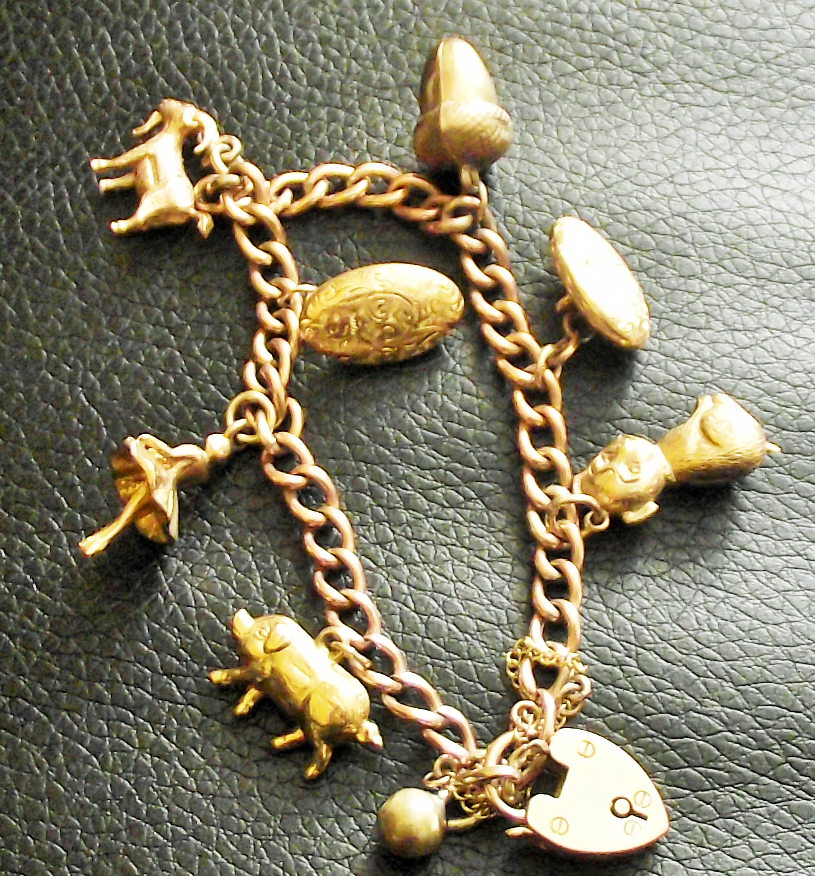 9ct gold padlock charm bracelet market 9ct with charms, pig , 2x buttons , goat , ballet dancer ,acorn, puppy all fully marked 9ct 375 15.6g approx