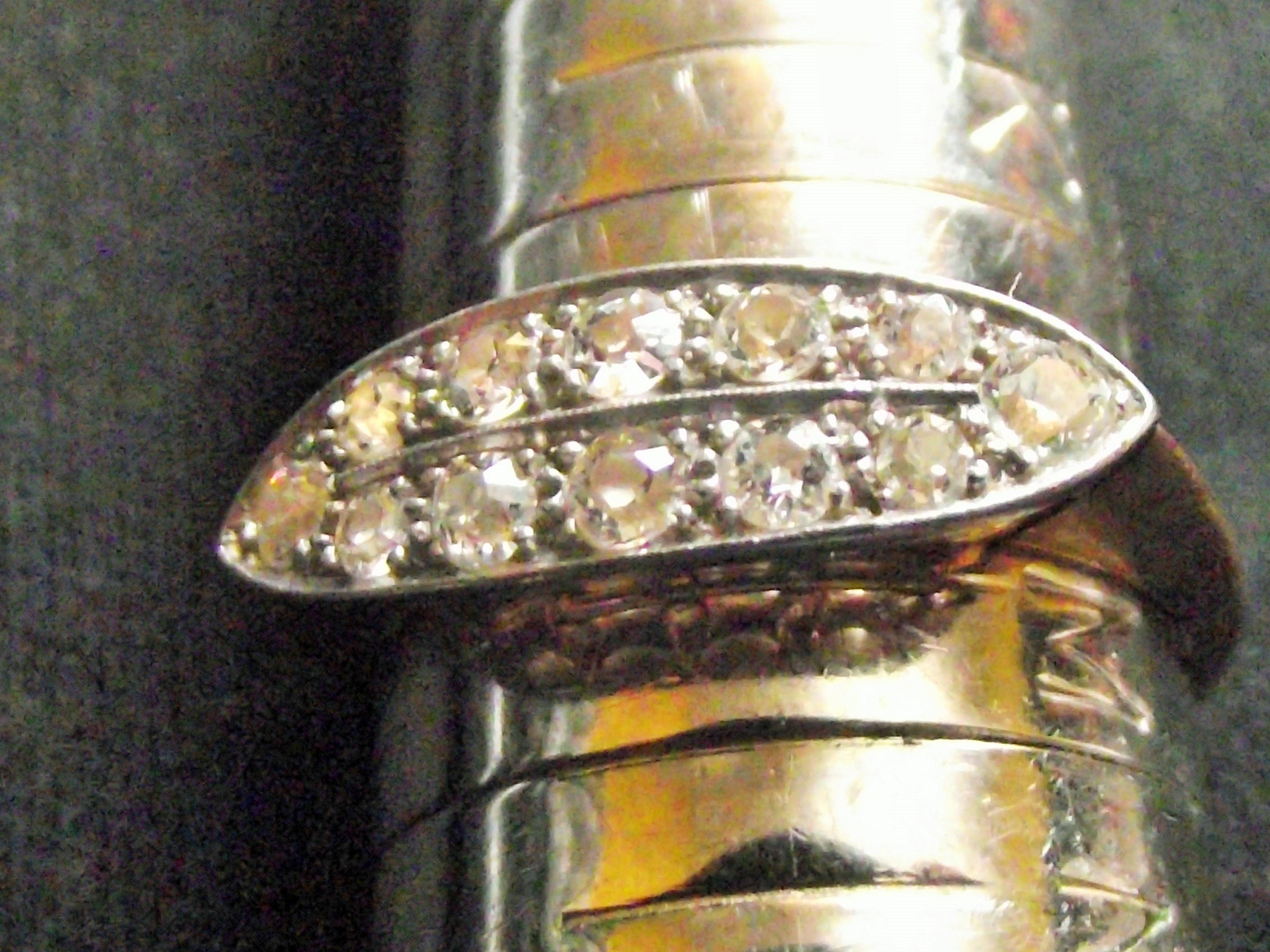 Ladies 18ct diamond set ring set with 12 small quality diamonds in elongated setting on a yellow gold band Unmarked ( Tested as 18ct ) size M 2.36 g approx