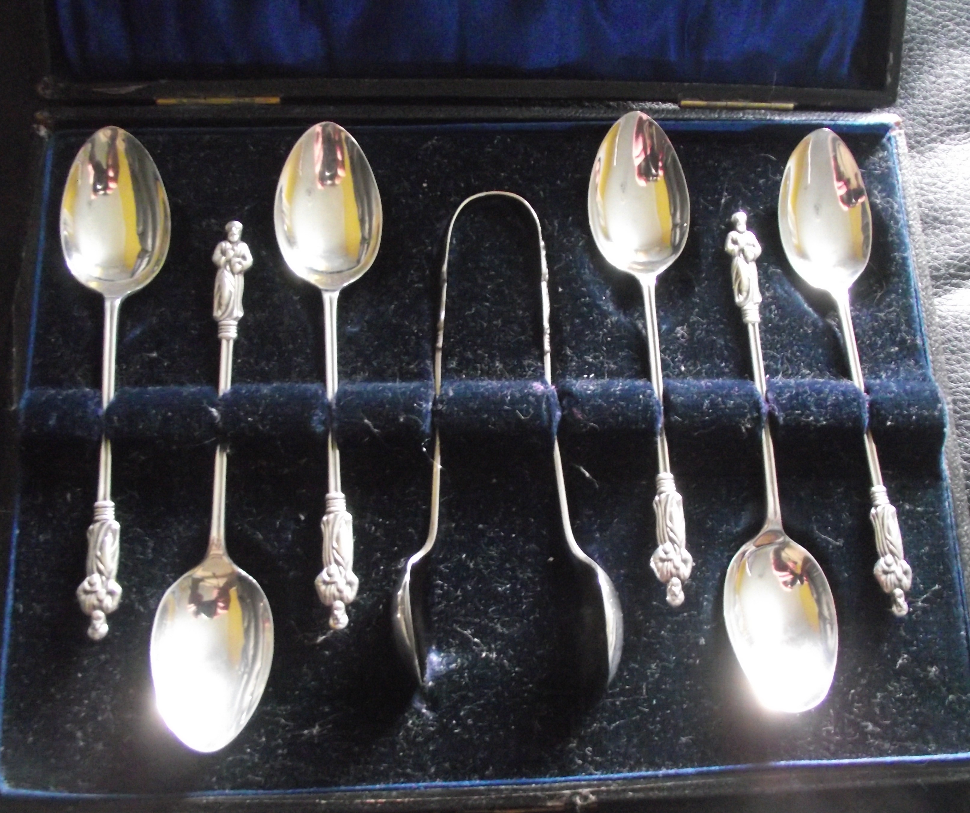 Cased set of sterling silver apostle spoons and sugar snips Birmingham 1908 A.J.Bailey 29.2g approx