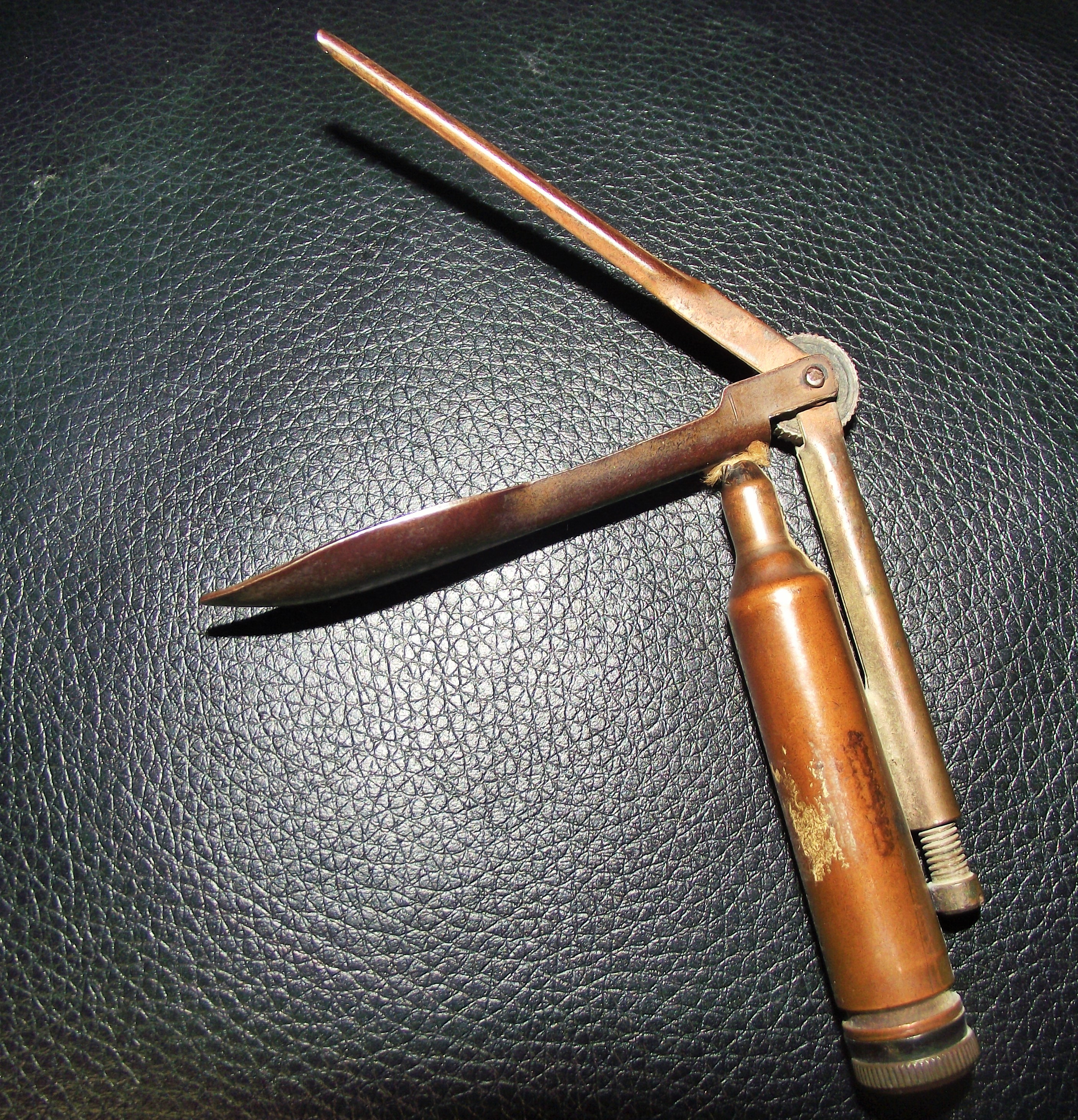 Rare bullet shaped brass trench pipe lighter with pipe cleaner and tobacco scoop attachments