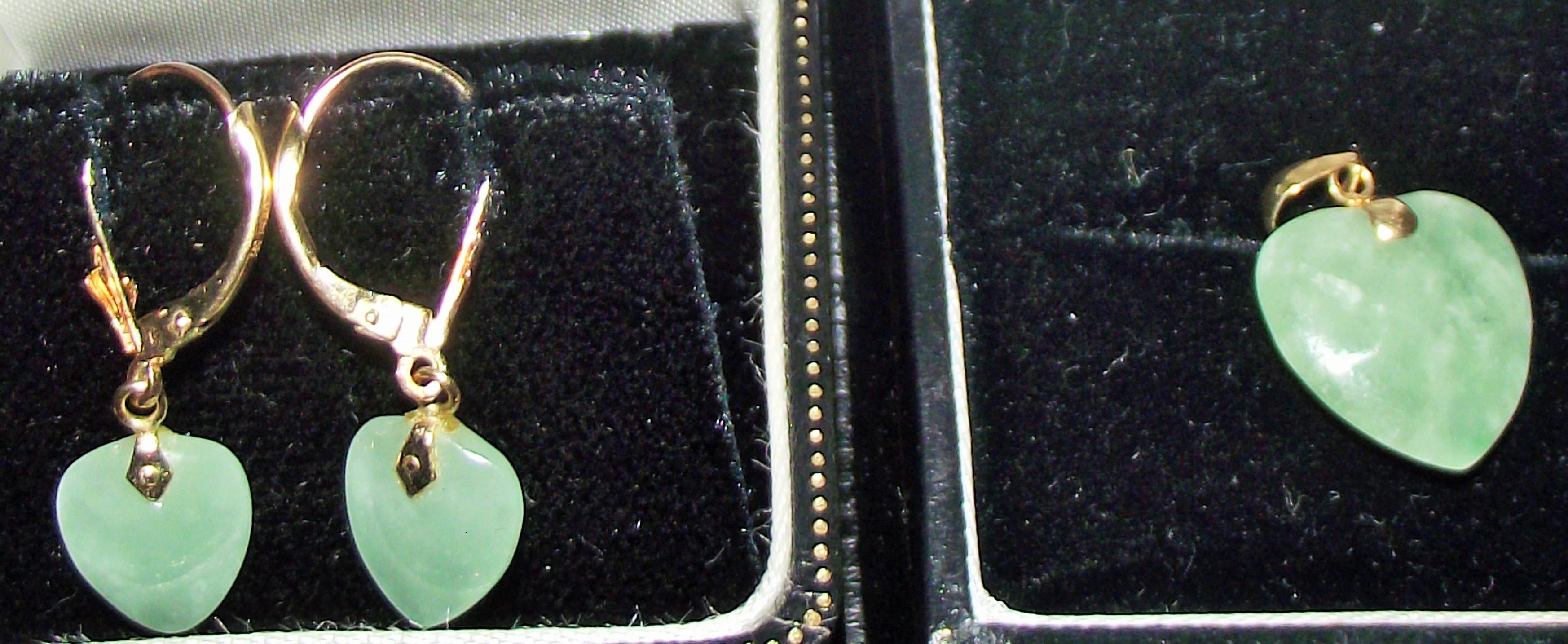 Pair of 14kt gold heart shaped pale green jadite jade earrings + 14kt gold heart shaped jadite jade pendant