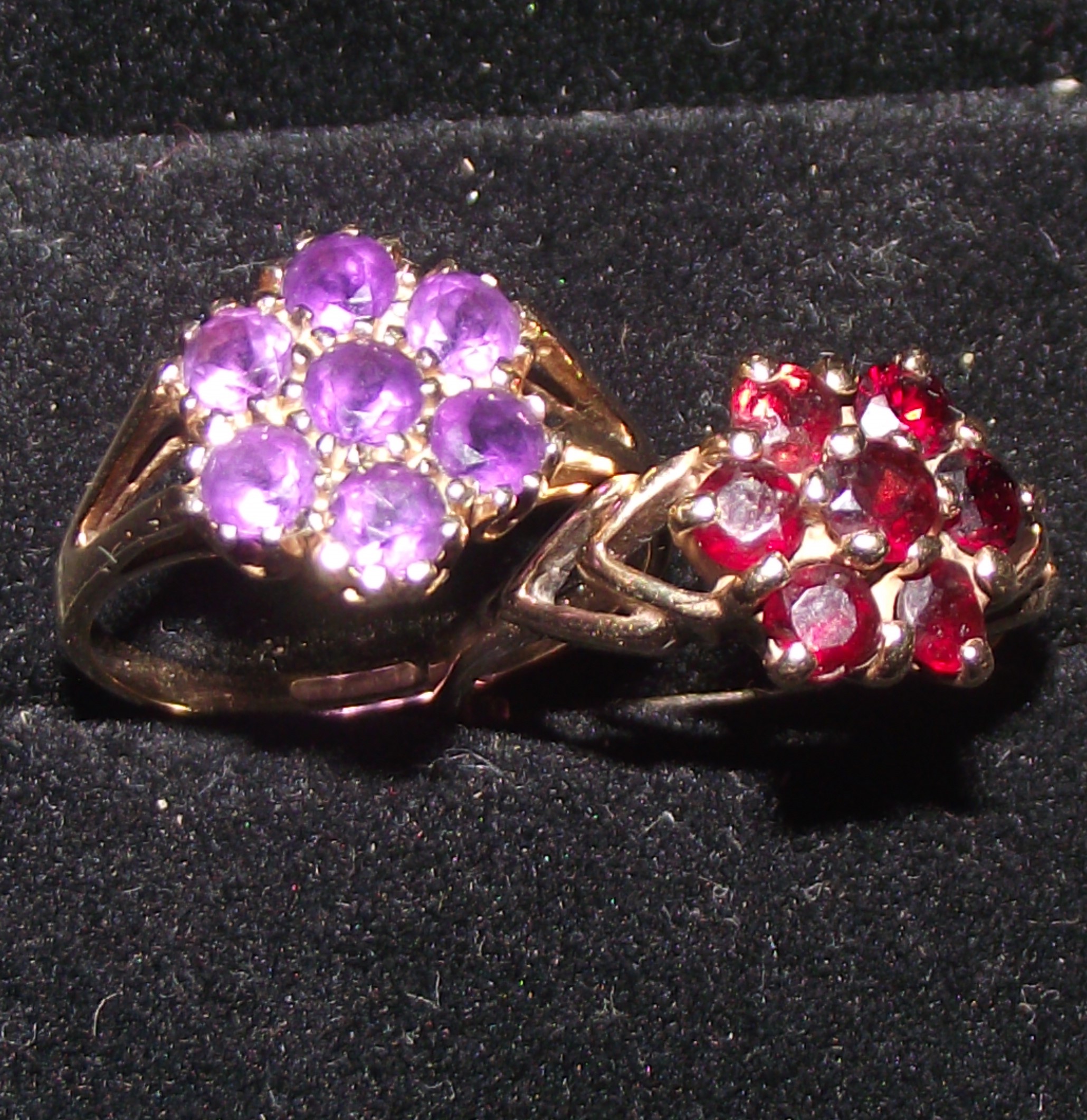 2x 9ct fully marked rings 5.3g approx sizes M & N Amathyst & garnet colour stones