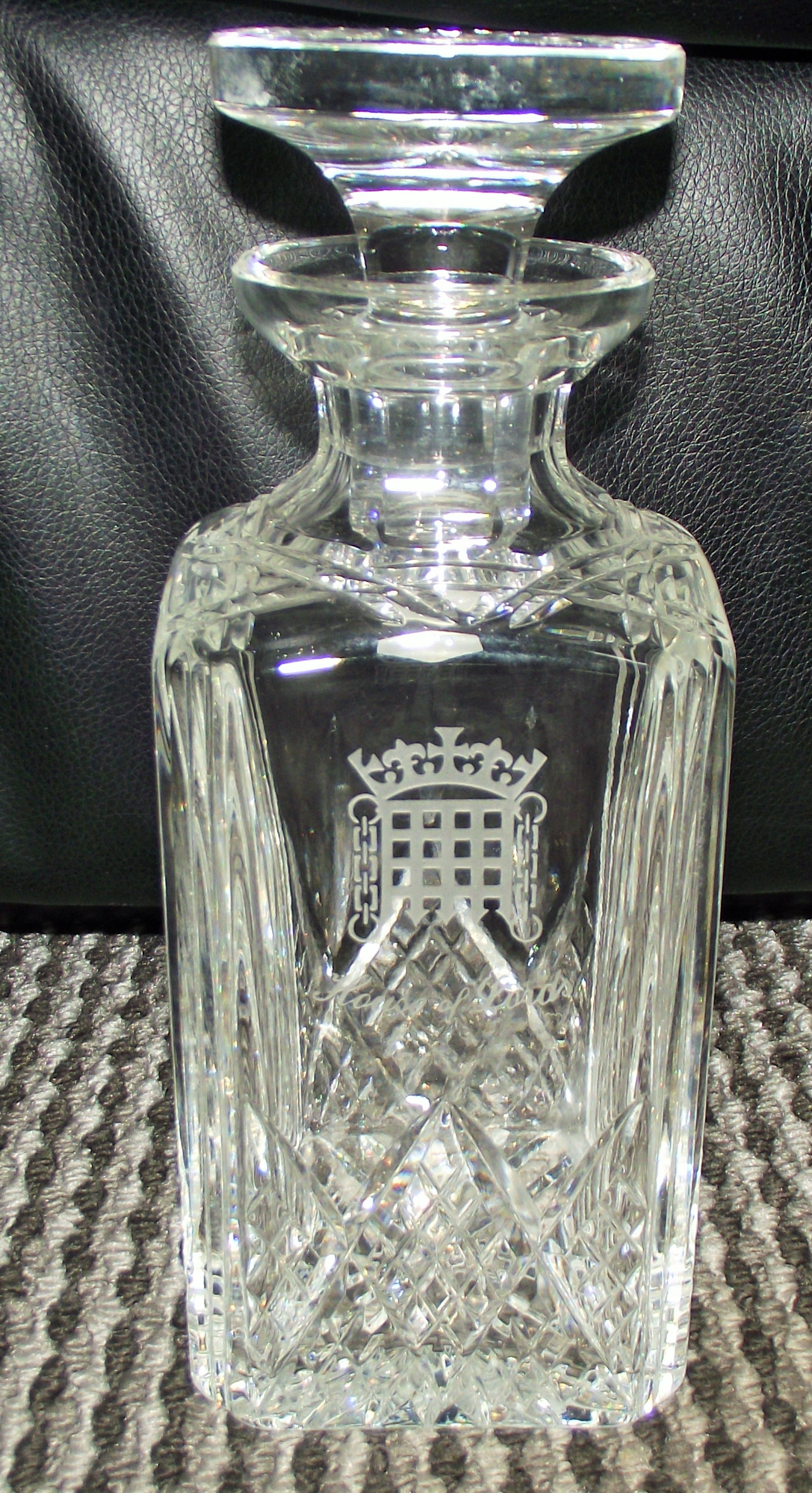 Rare Stuart Crystal house of commons engraved decanter with coat of arms Stuart crystal label on reverse