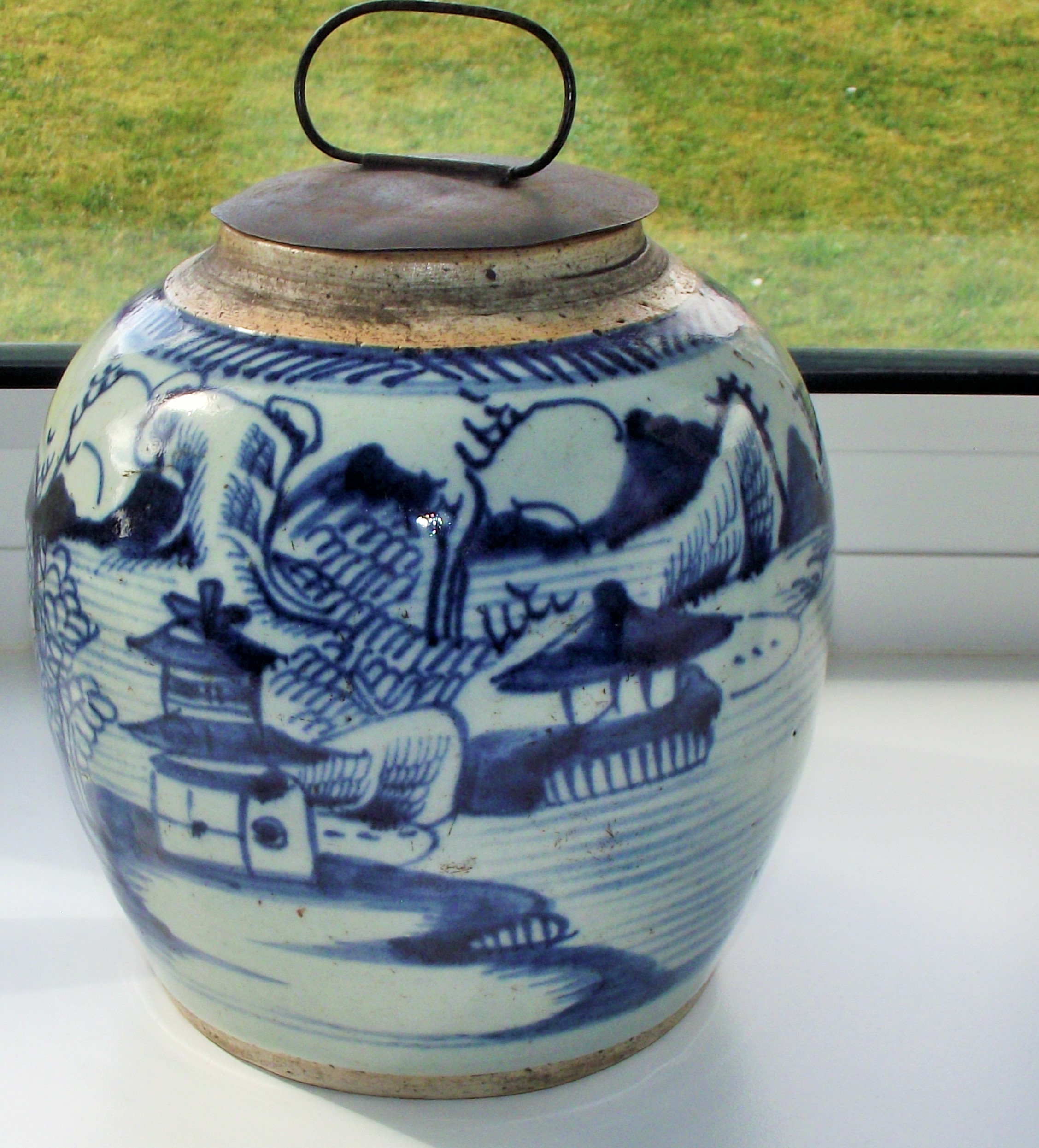 Large highly decorated blue & white 19thC ginger jar with original cork & metal lid