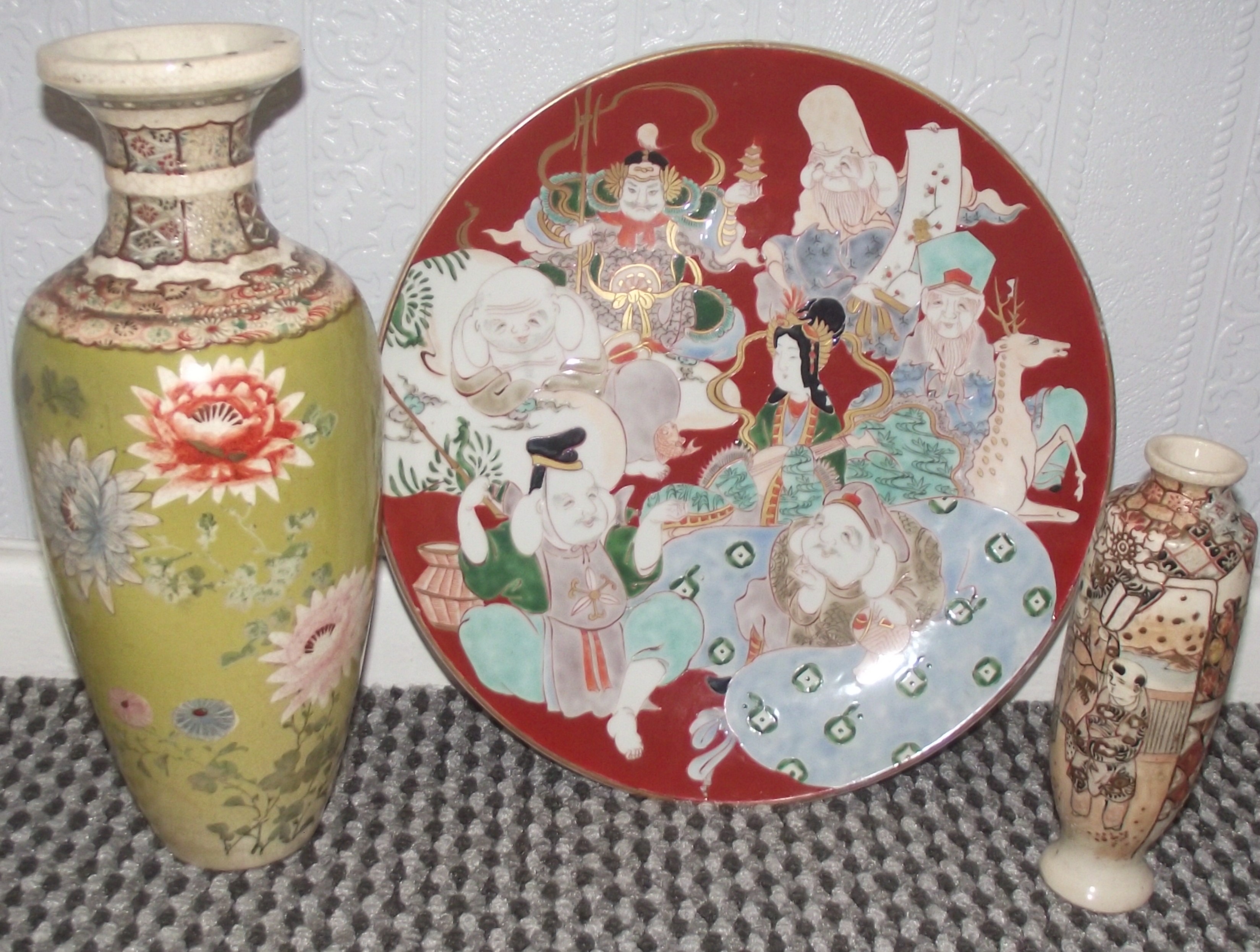 Large Japanese style charger + large floral decorated green groound oriental syle vase + small satsuma style vase