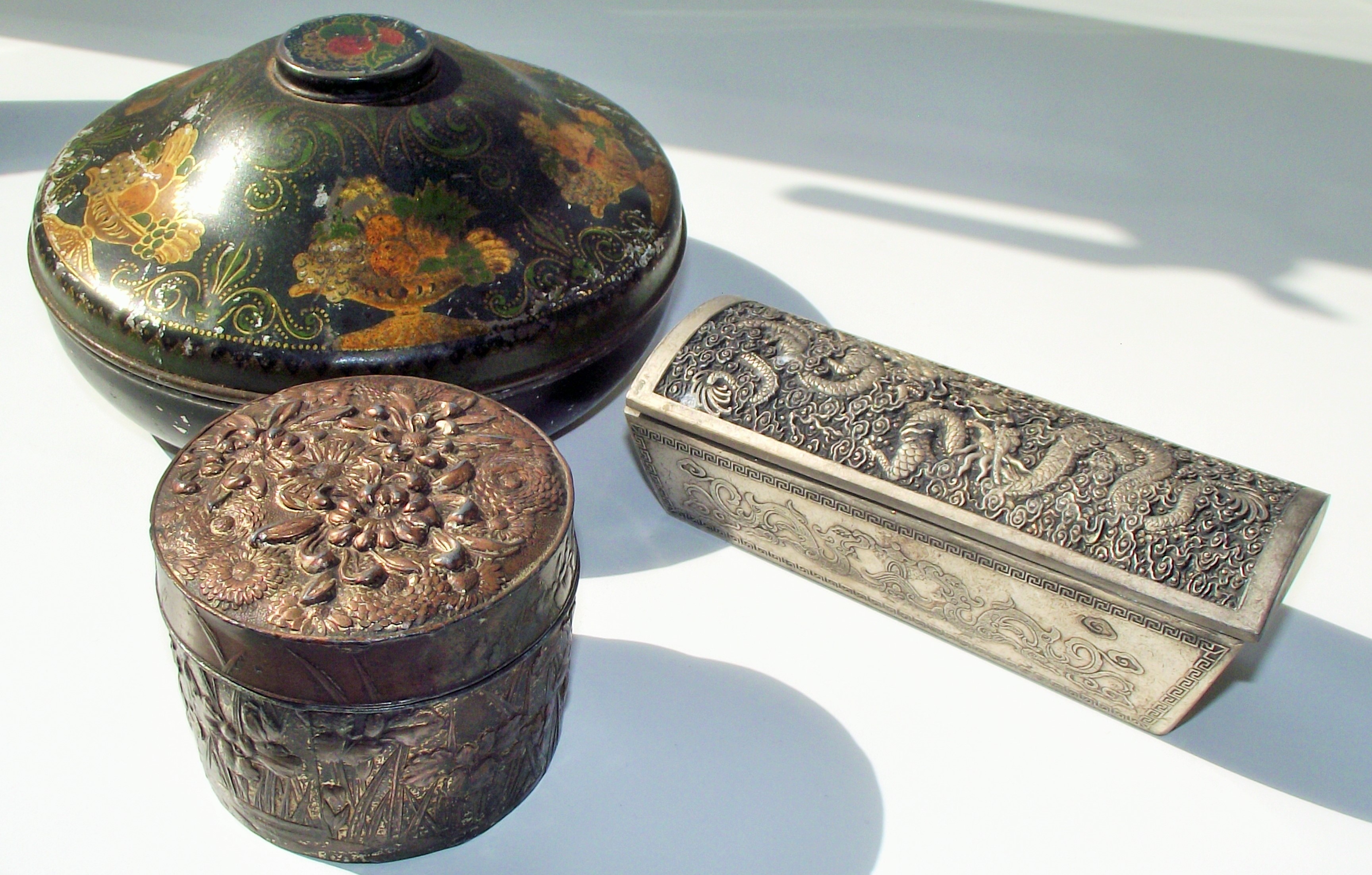 Oriental relief lidded circular box decorated with chrysanthamum flowers and reeds+ oblong oriental lidded box decorated with dragons +Vintage Rowntree circlar lidded sweet tin oriental style design ( Stamped Rowntree )