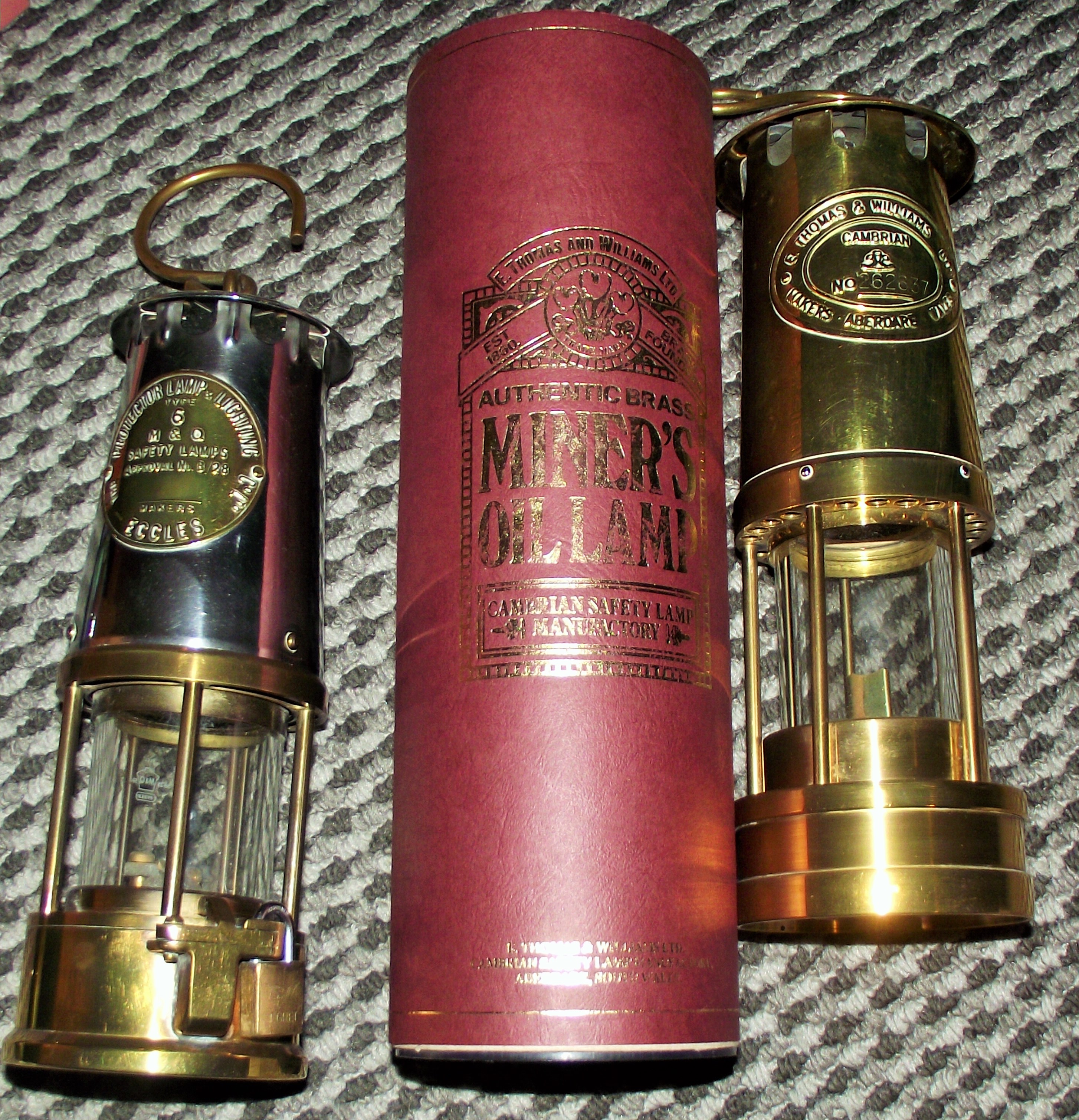 2 x miners lamps Cambrian all brass B thomas Williams No 262367 with original case and certificate of origin + brass and steel Eccles safety lamp typeNo6
