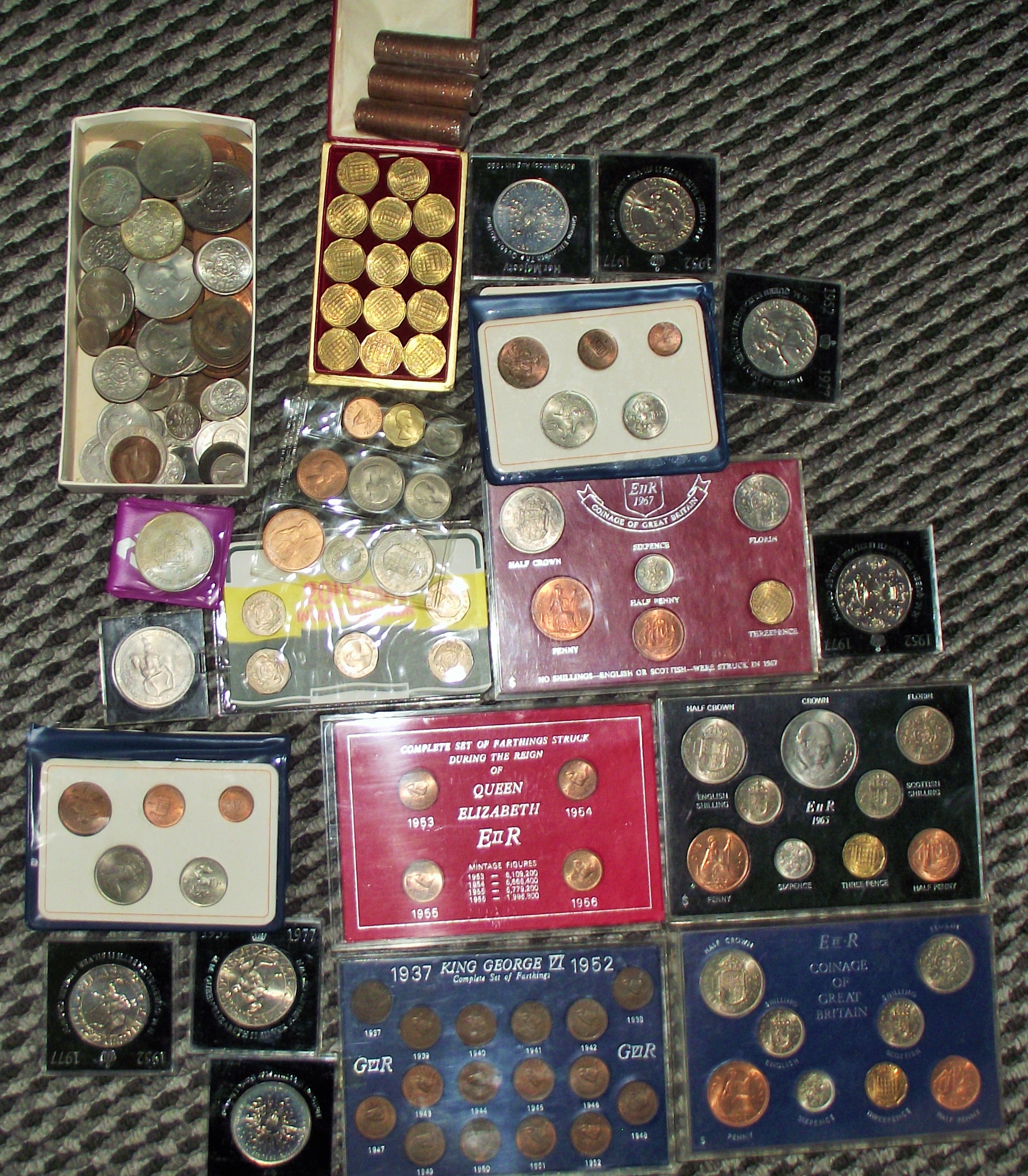 Good selection of coin sets inc farthings , crowns , rolls of half pence pieces , loose coins etc