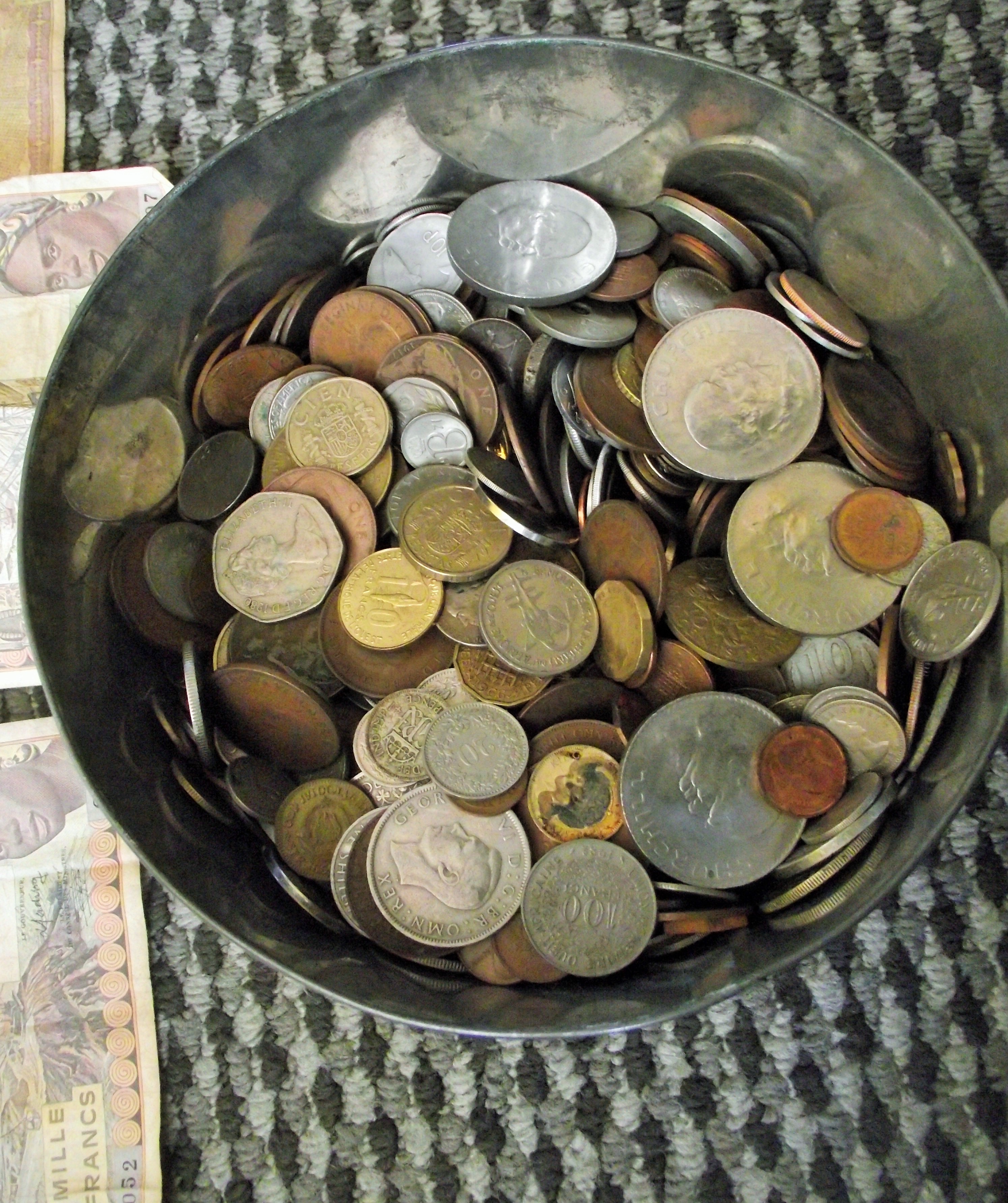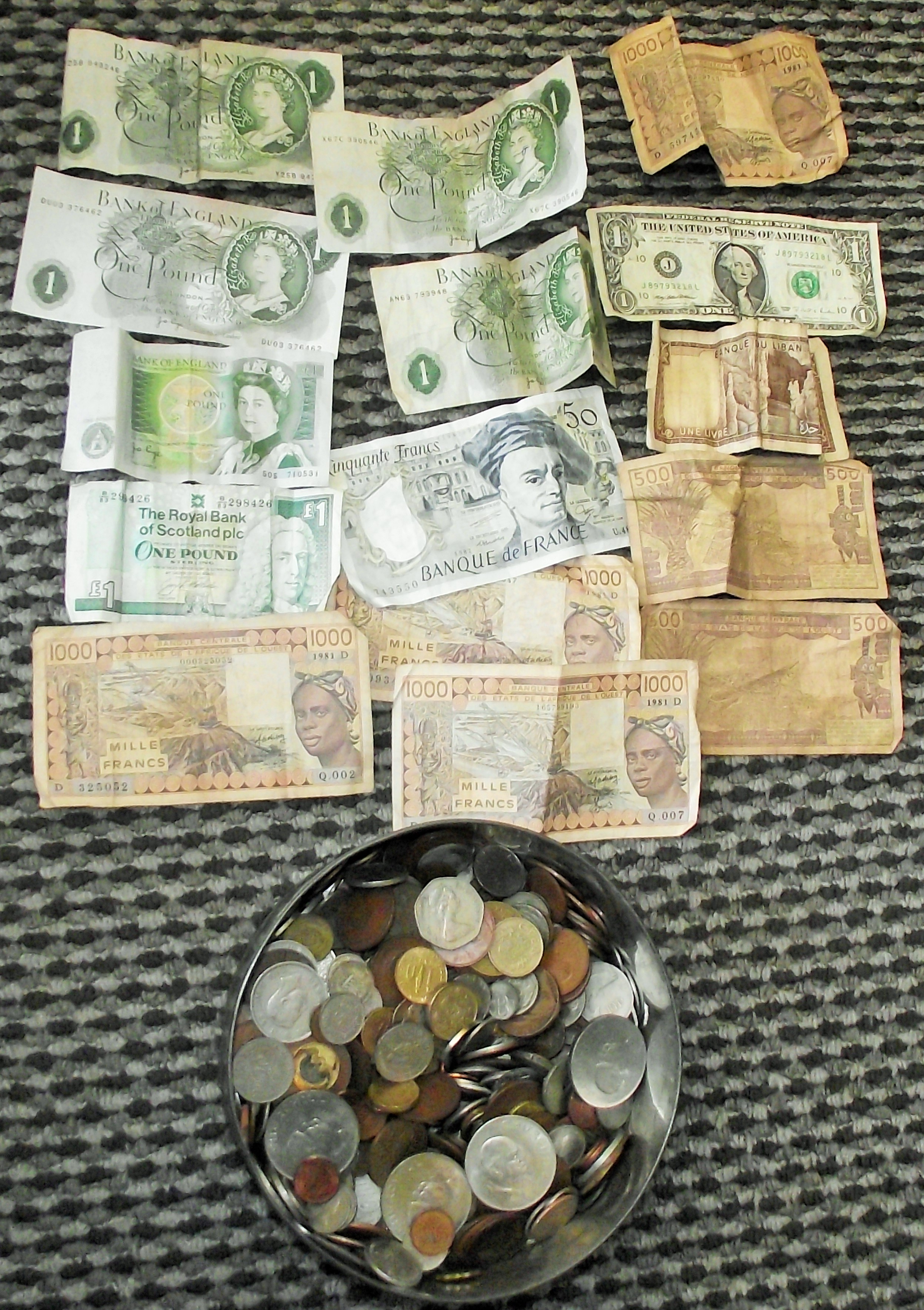 Selection of various Bank notes and coins from around the world inc british notes and coins