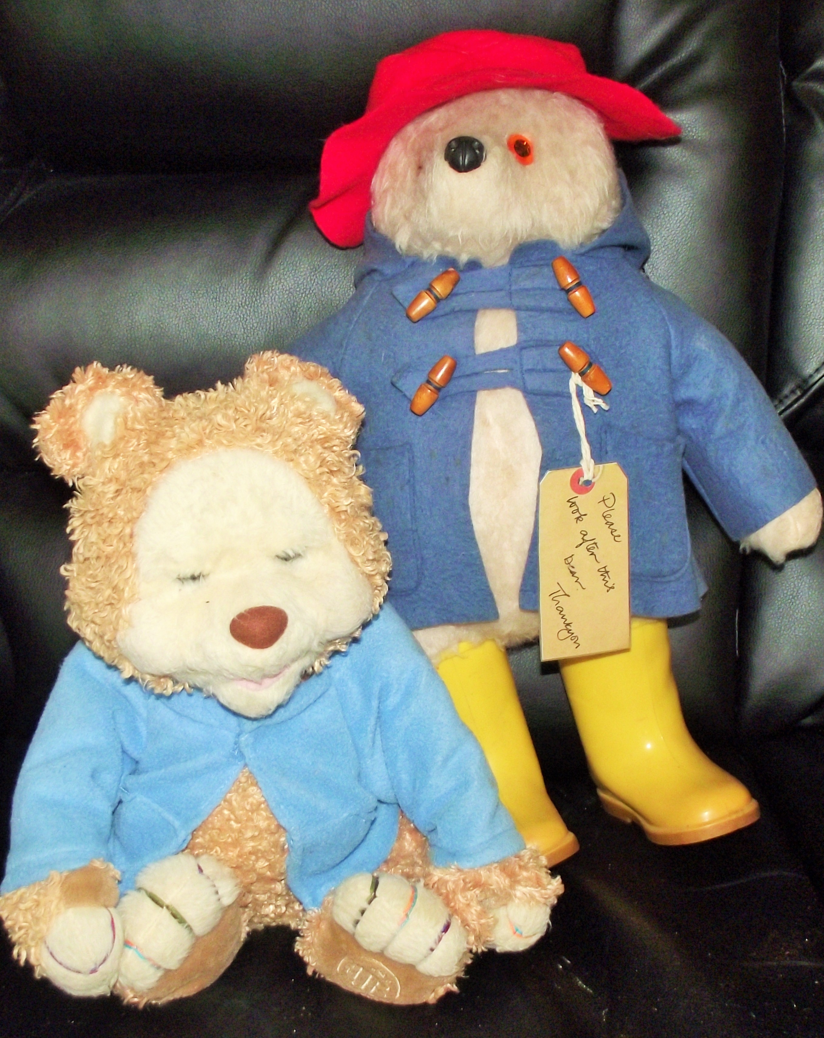 Gabrielle Paddington Bear Original 1970’s Vintage Coat Hat Yellow Dunlop Boots +Vintage Playskool TJ Bearytales Animated Talking Singing Plush Bear ( with moving animated arms, eyes, ears, battery operated )
