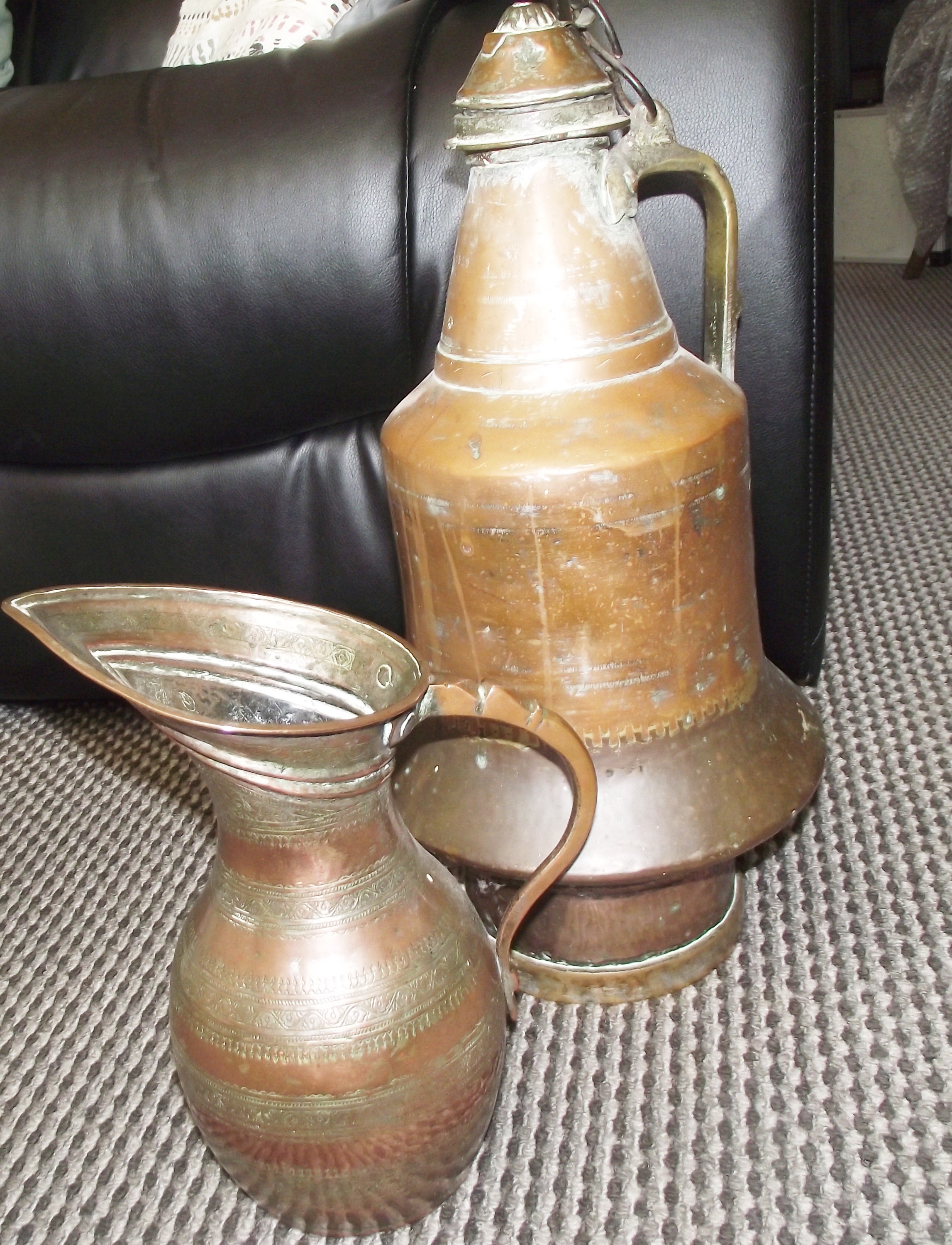 A LARGE ANTIQUE 19th Century heavy gauge Middle Eastern Copper lidded Ewer with brass handle 20″ high + 19thc heavy gauge highly decorated copper & Brass water jug 12″ high