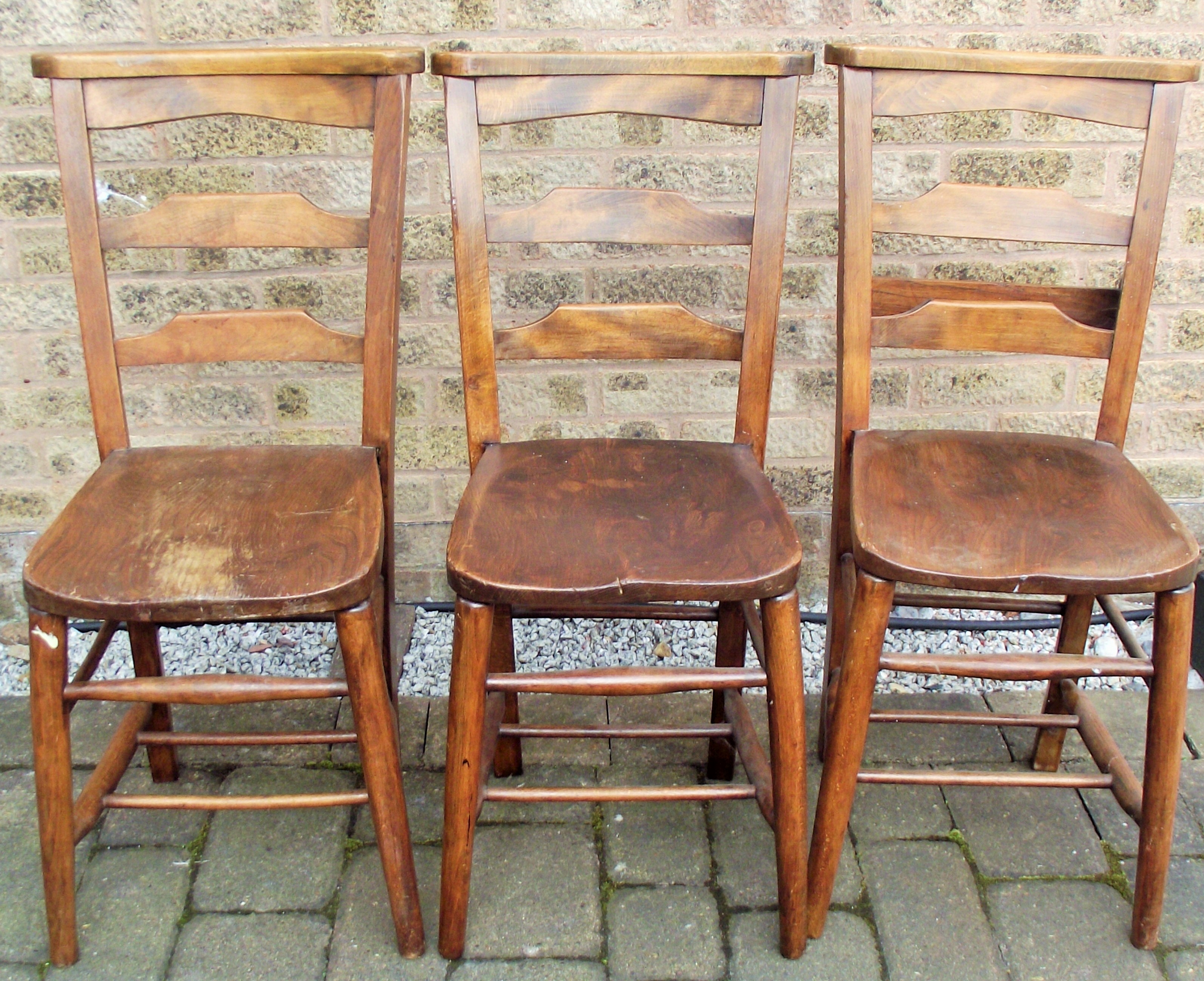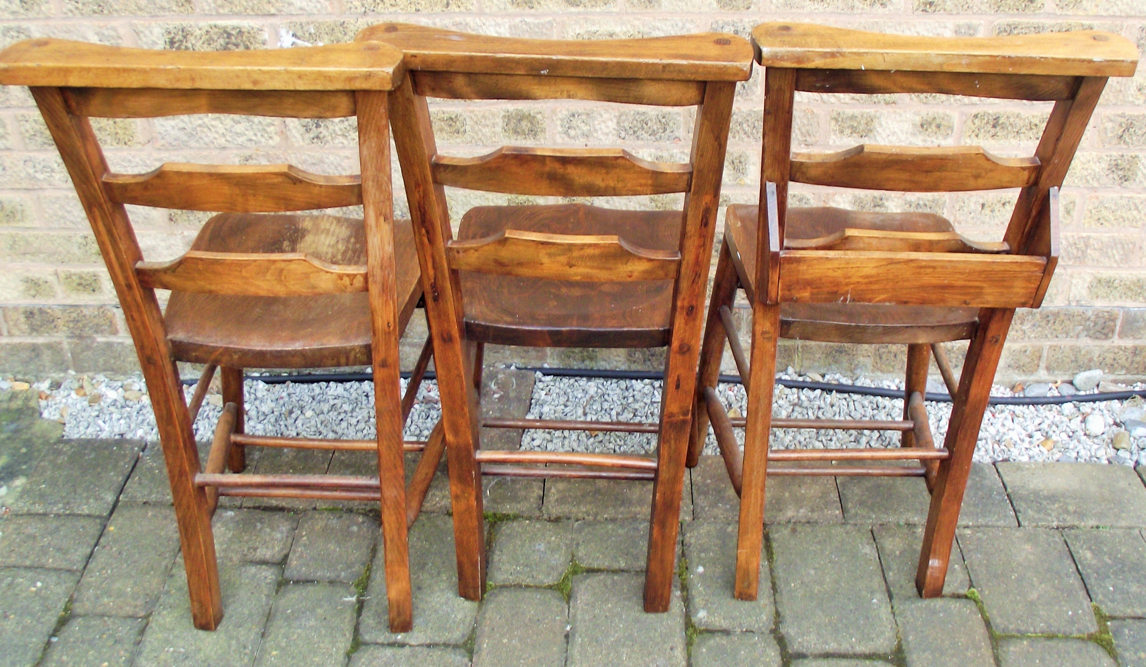 3X Vintage oak chapel chairs one with book rest on back