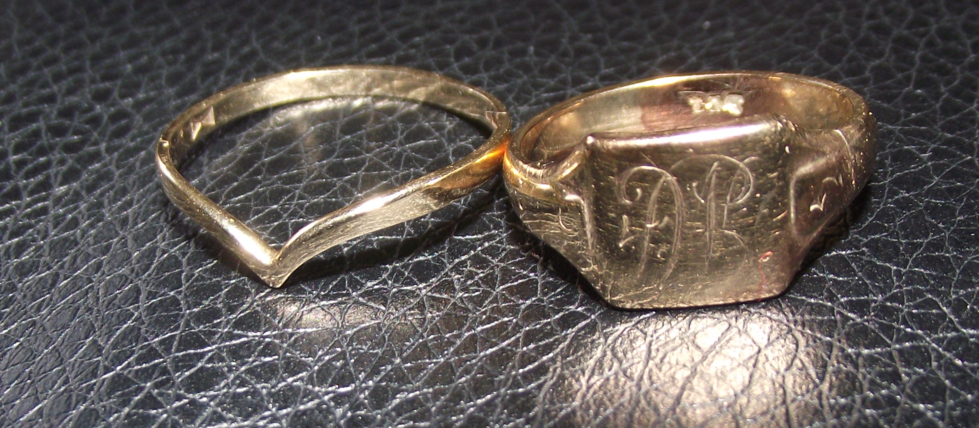 Gents 9ct signet ring + ladies 9ct wishbone ring 4.1g approx