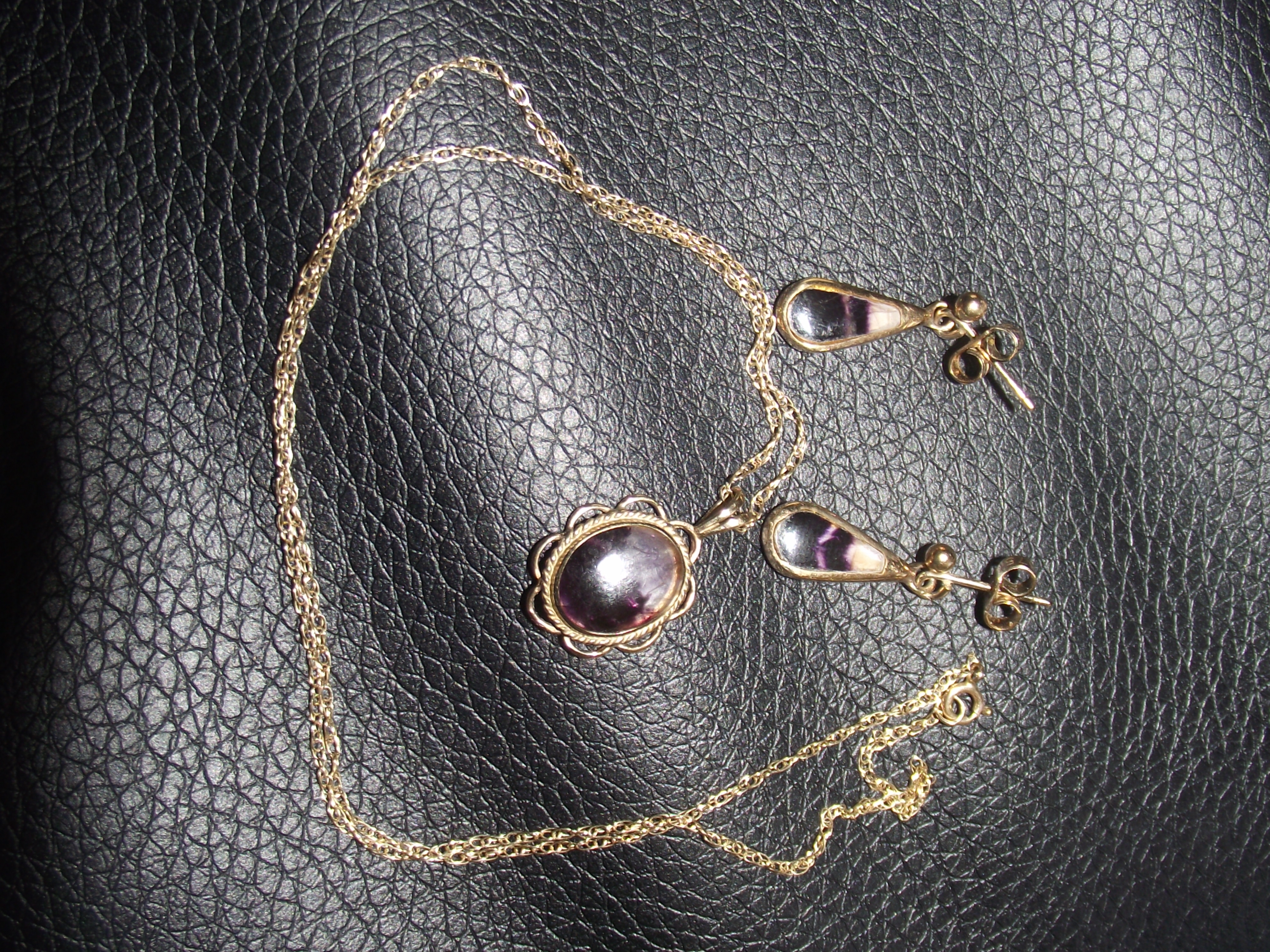 9ct gold Blue john pendant on 9ct chain + pair 9ct gold Blue john set drop earrings 4.6g approx