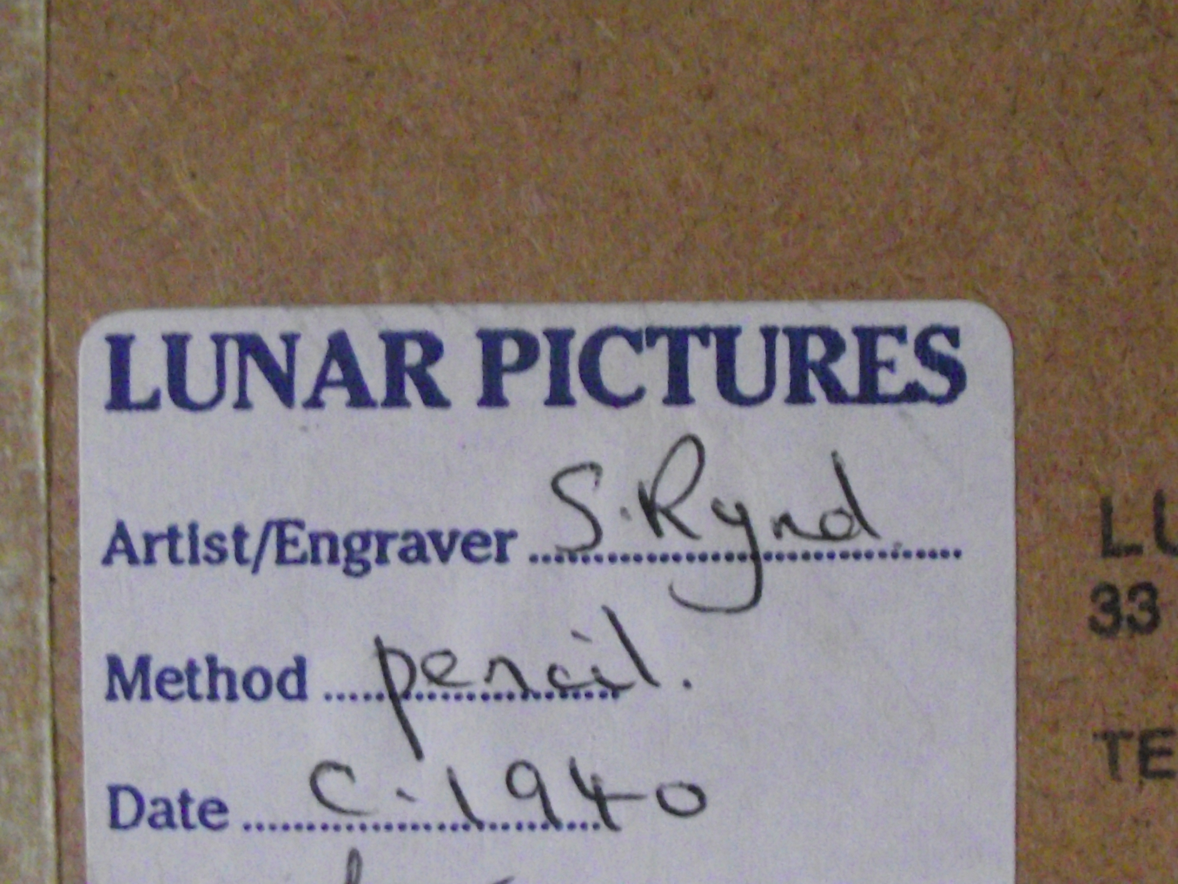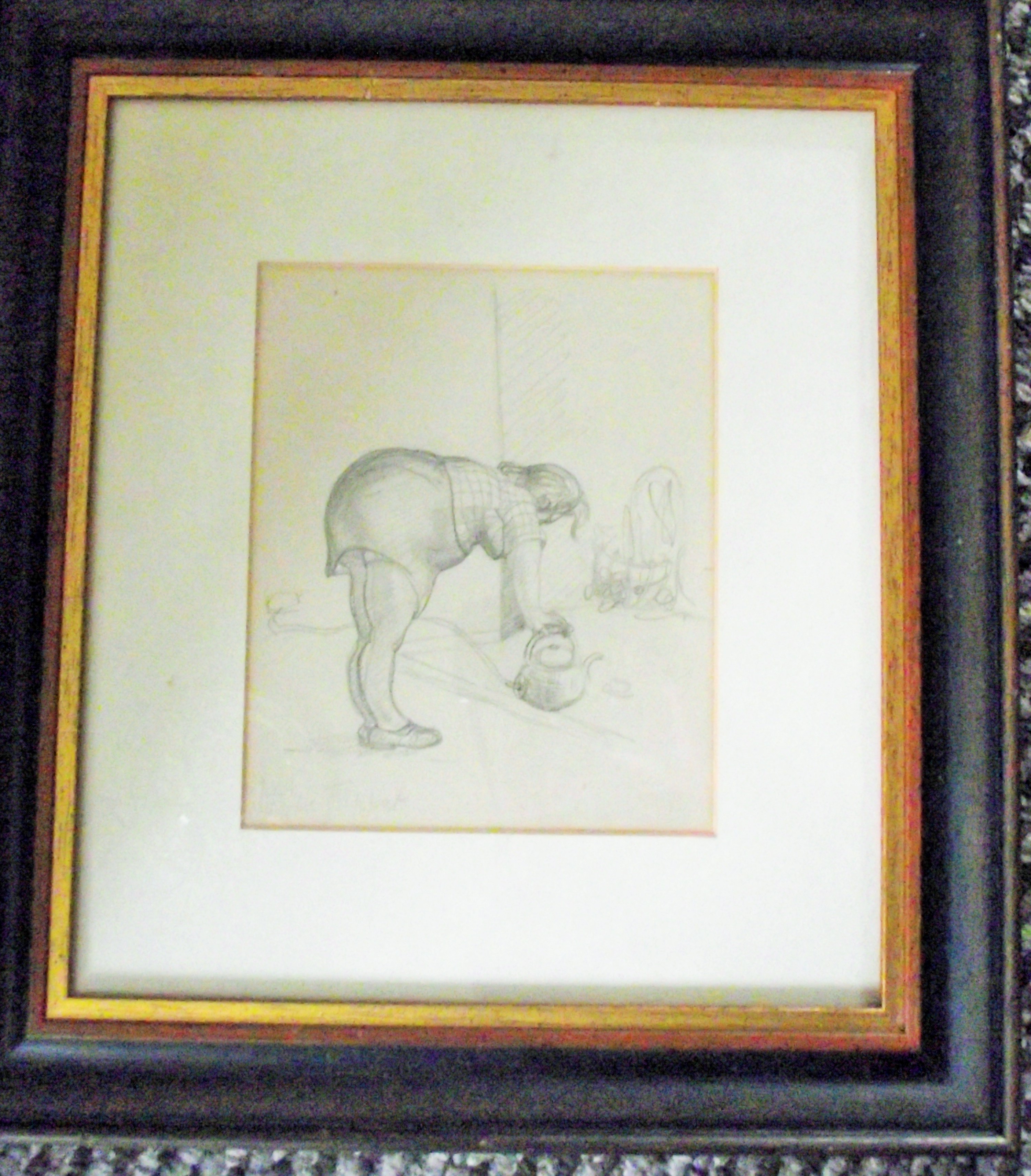 Framed & glazed humourous pencil drawing titled Miss Tippet , gallery label to reverse S Rynd circa 1940