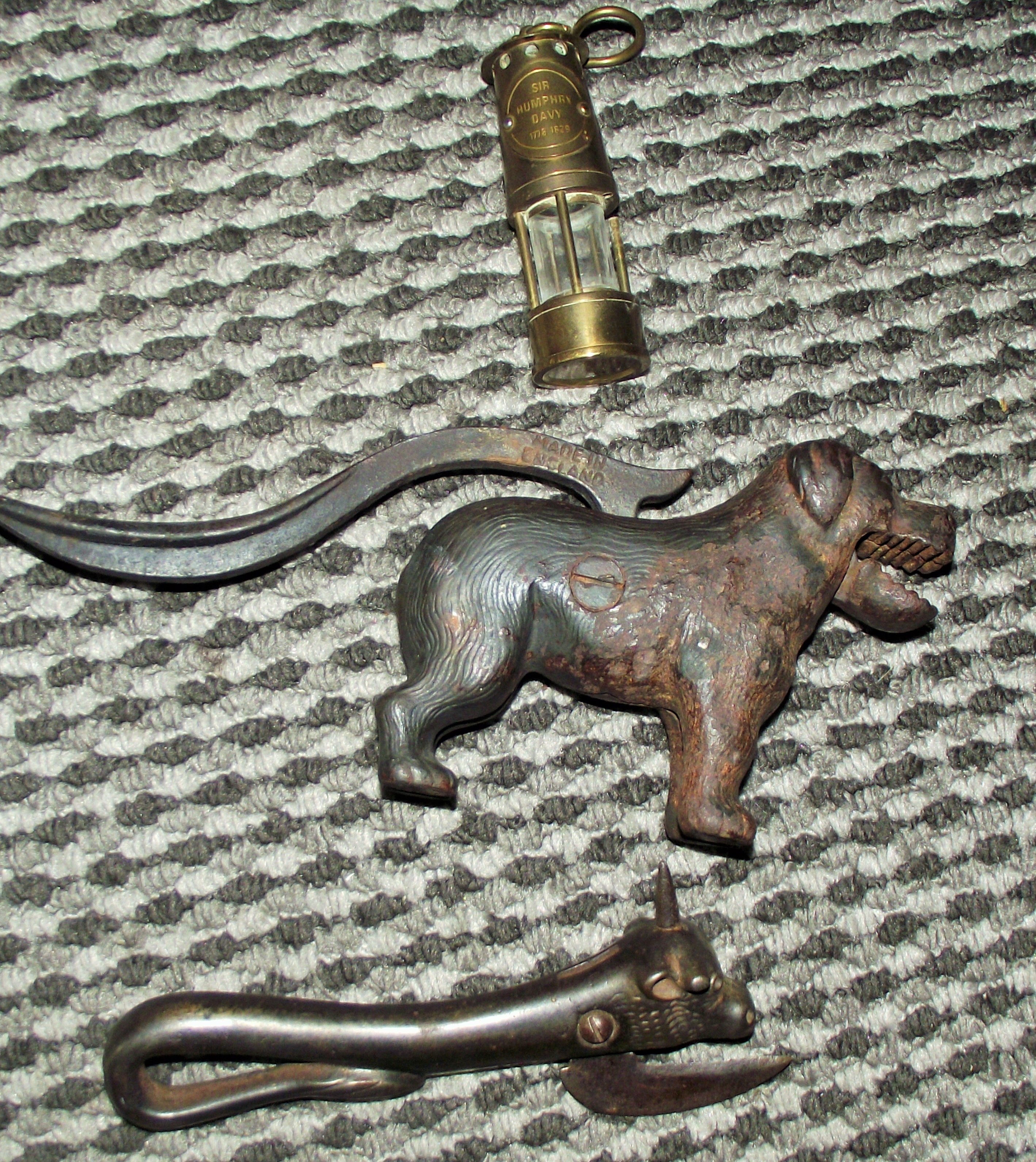 Set of Antique 19thC dog wrought iron nut crackers + Antique 19thC wrought iron bull head can opener + miniature brass miners lamp