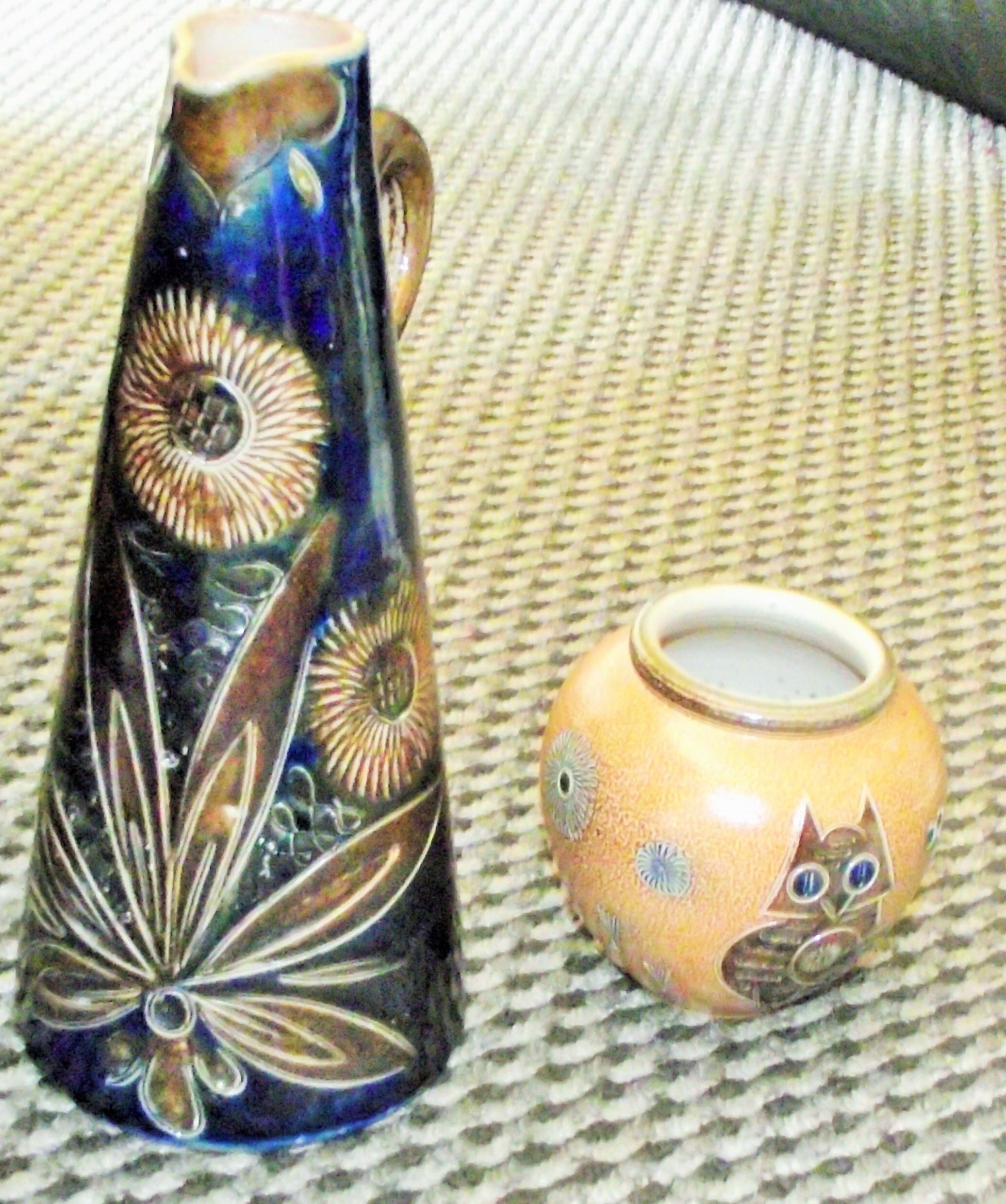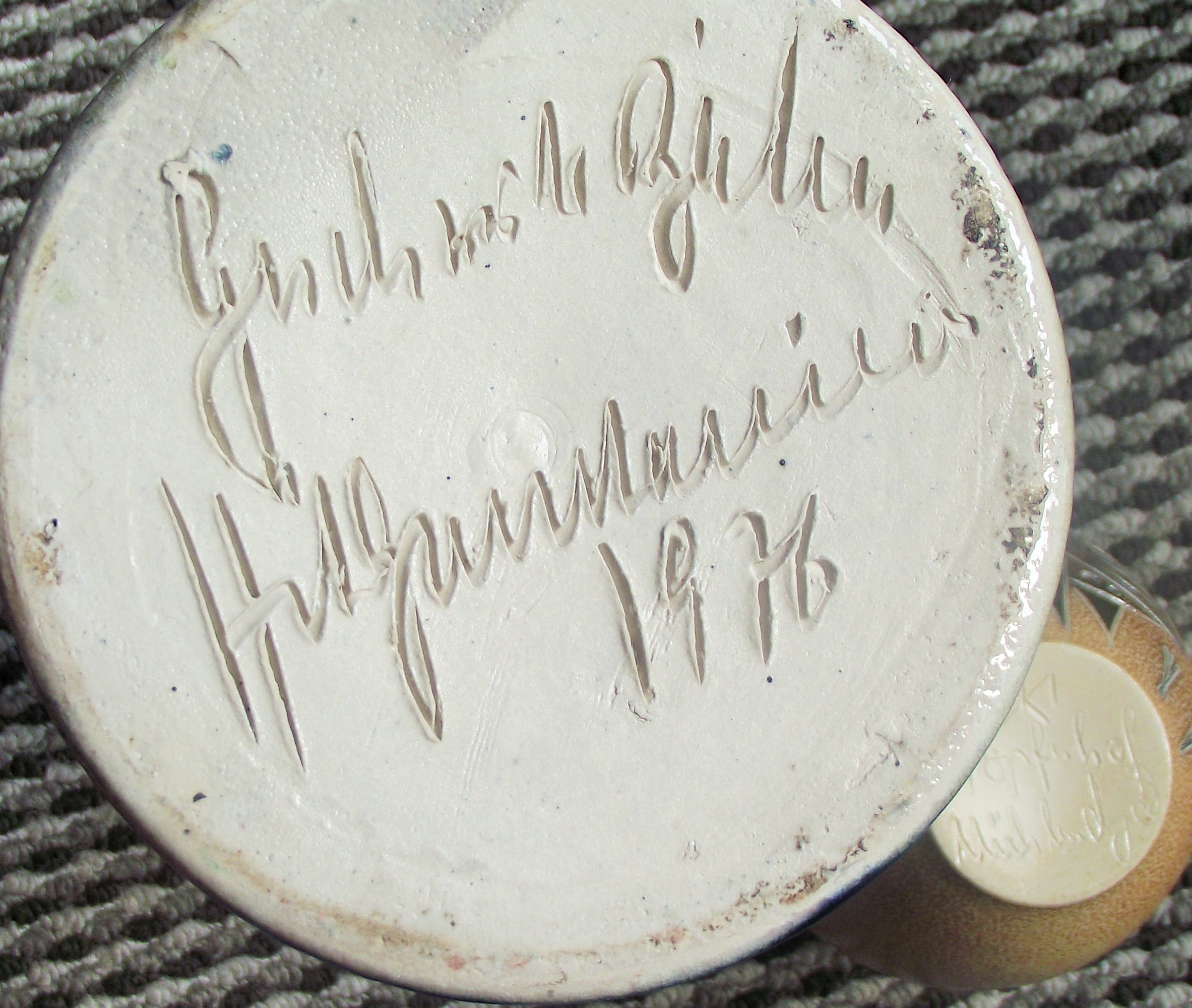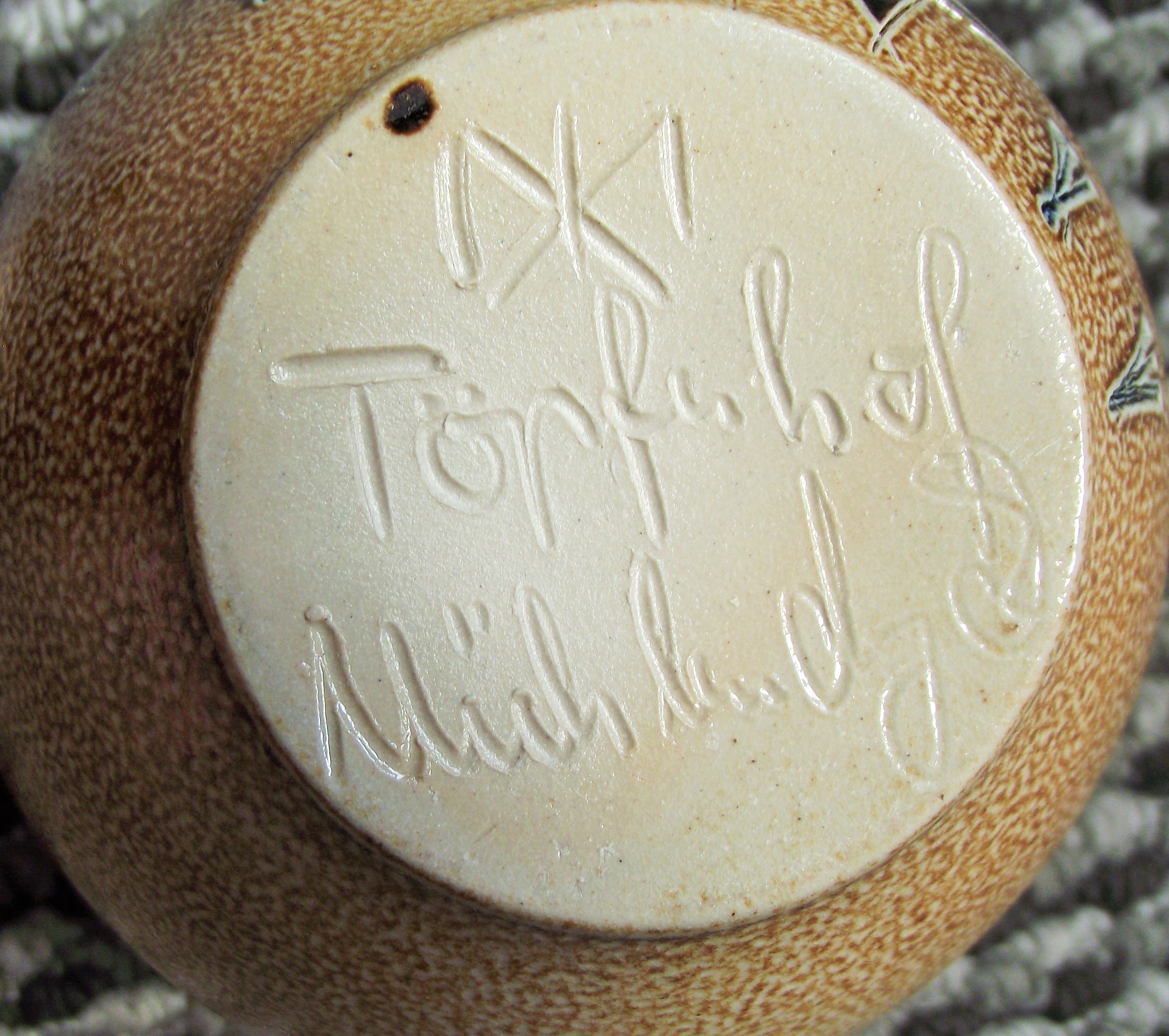 studio ceramics signed Westerwald owls 1950 s mid-century Germany + German incised decorated tall handle jug blue ground brown incised decoration signed underside