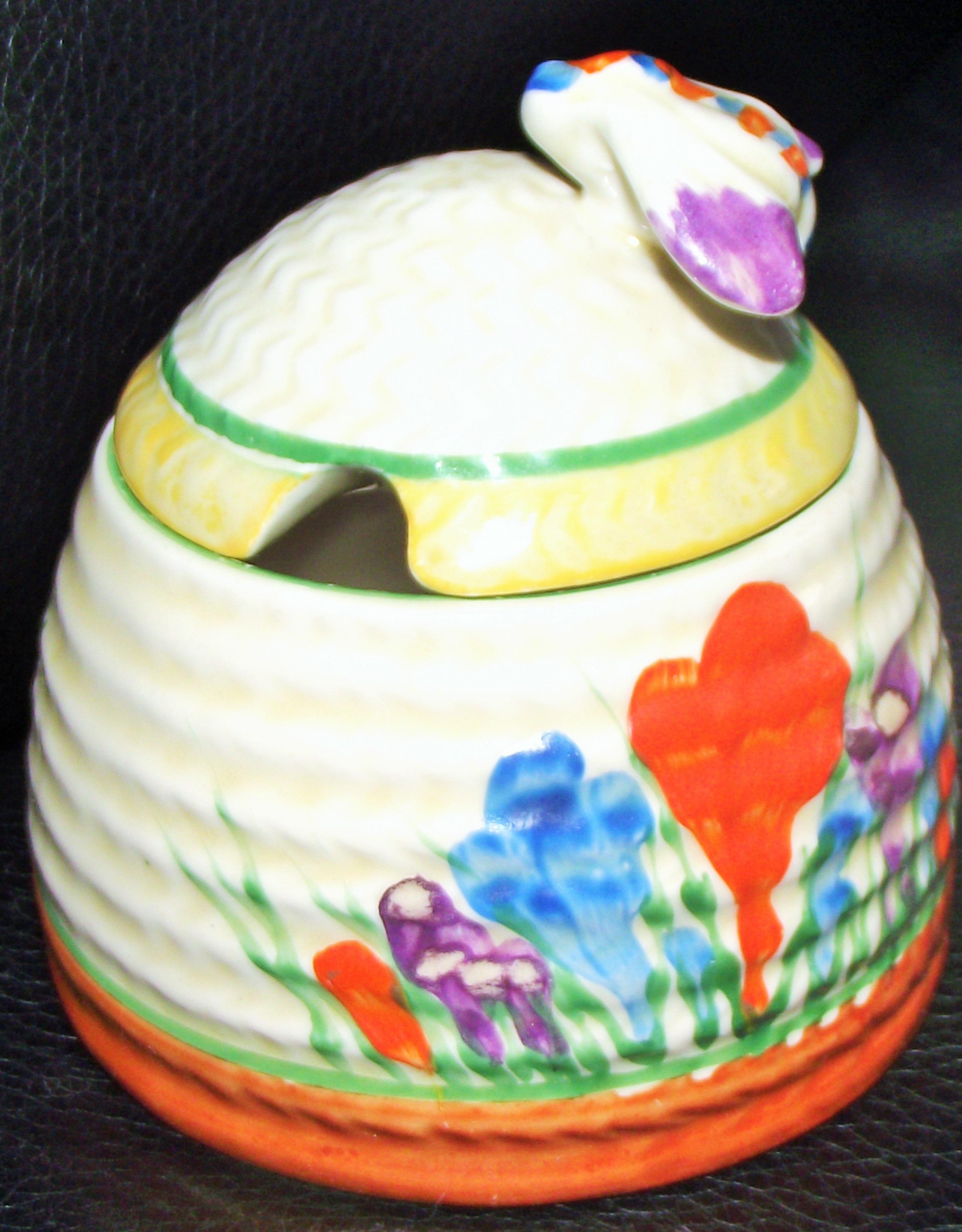 Clarice cliff honey pot with lid, Crocus pattern bee handle 3″ Tall .