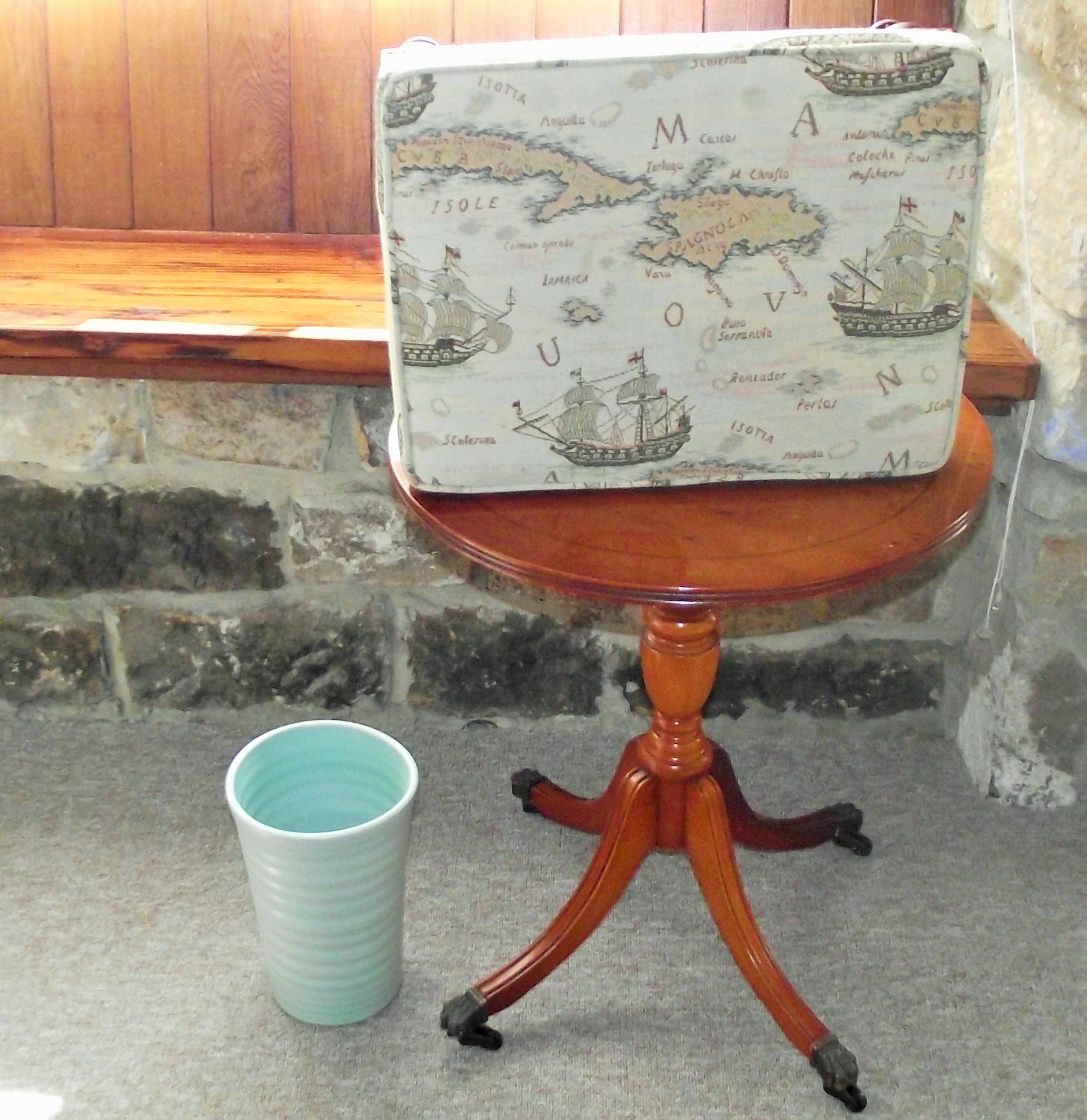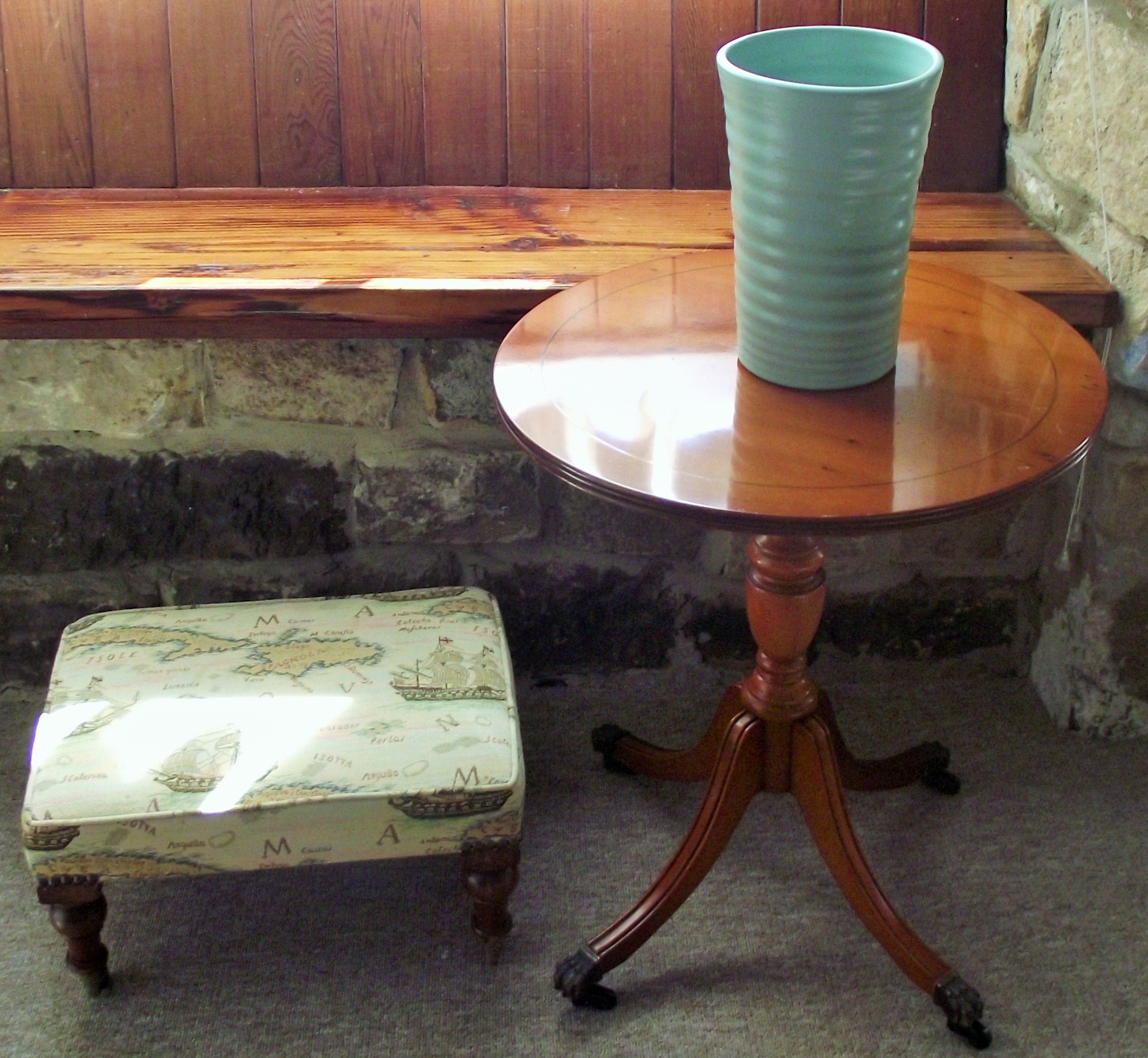 small modern light colour wine table on castors + Bourne Denby vase + footstool with shipping theme pattern