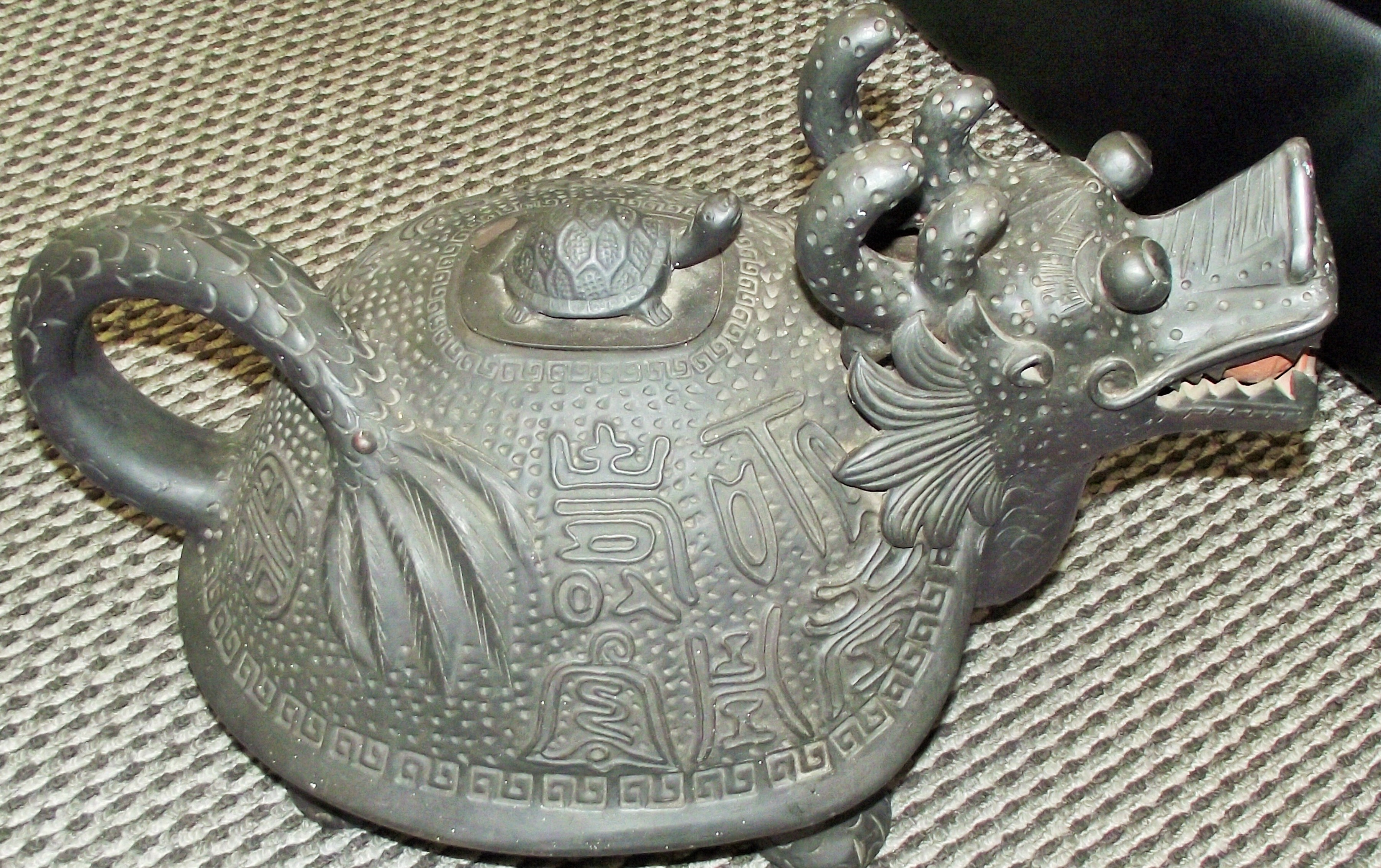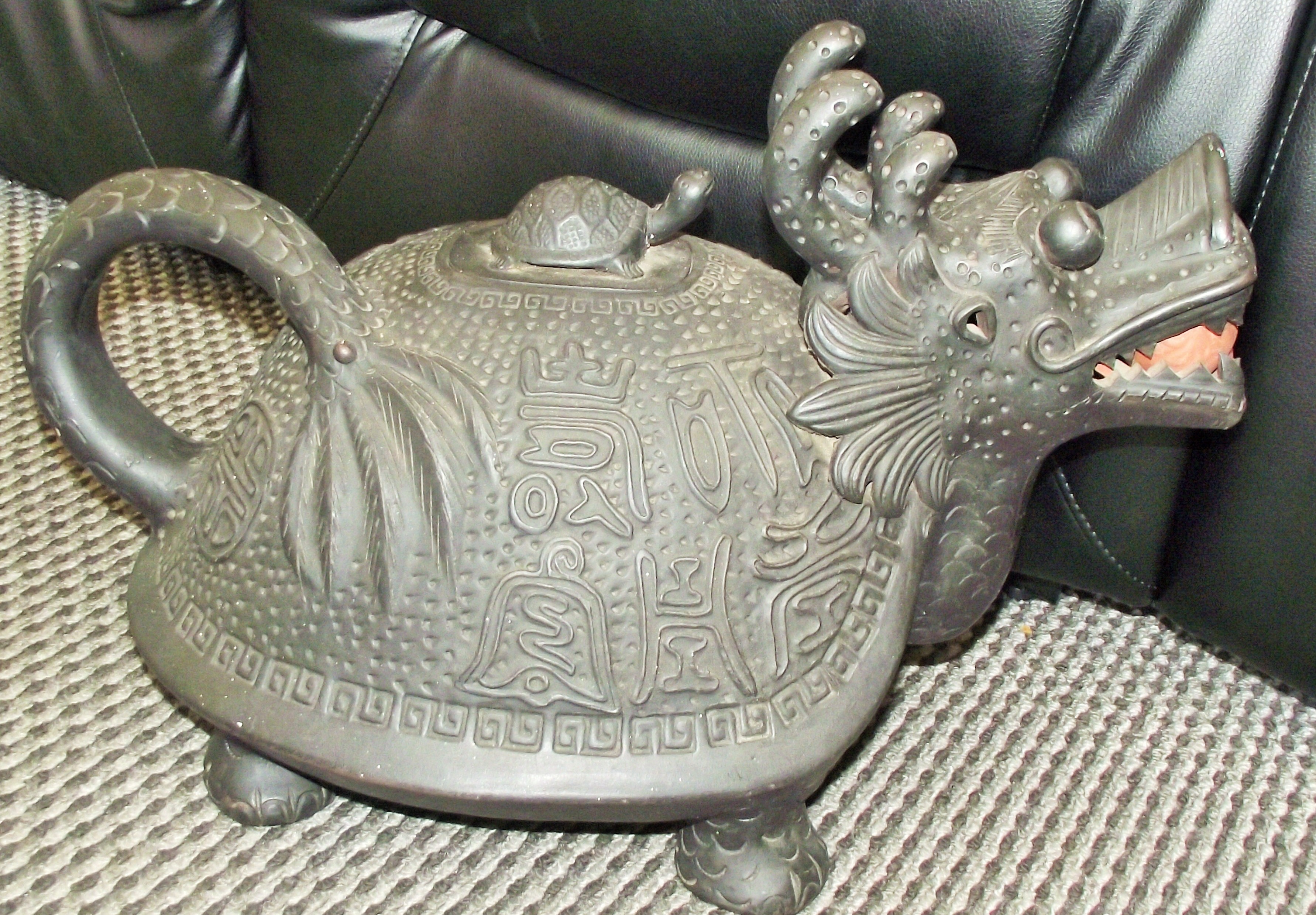 Unusually large vintage chinese yixing zisha clay turtle shell/ dragon pot with ball in mouth turtle lid 20″ length 13″ high approx