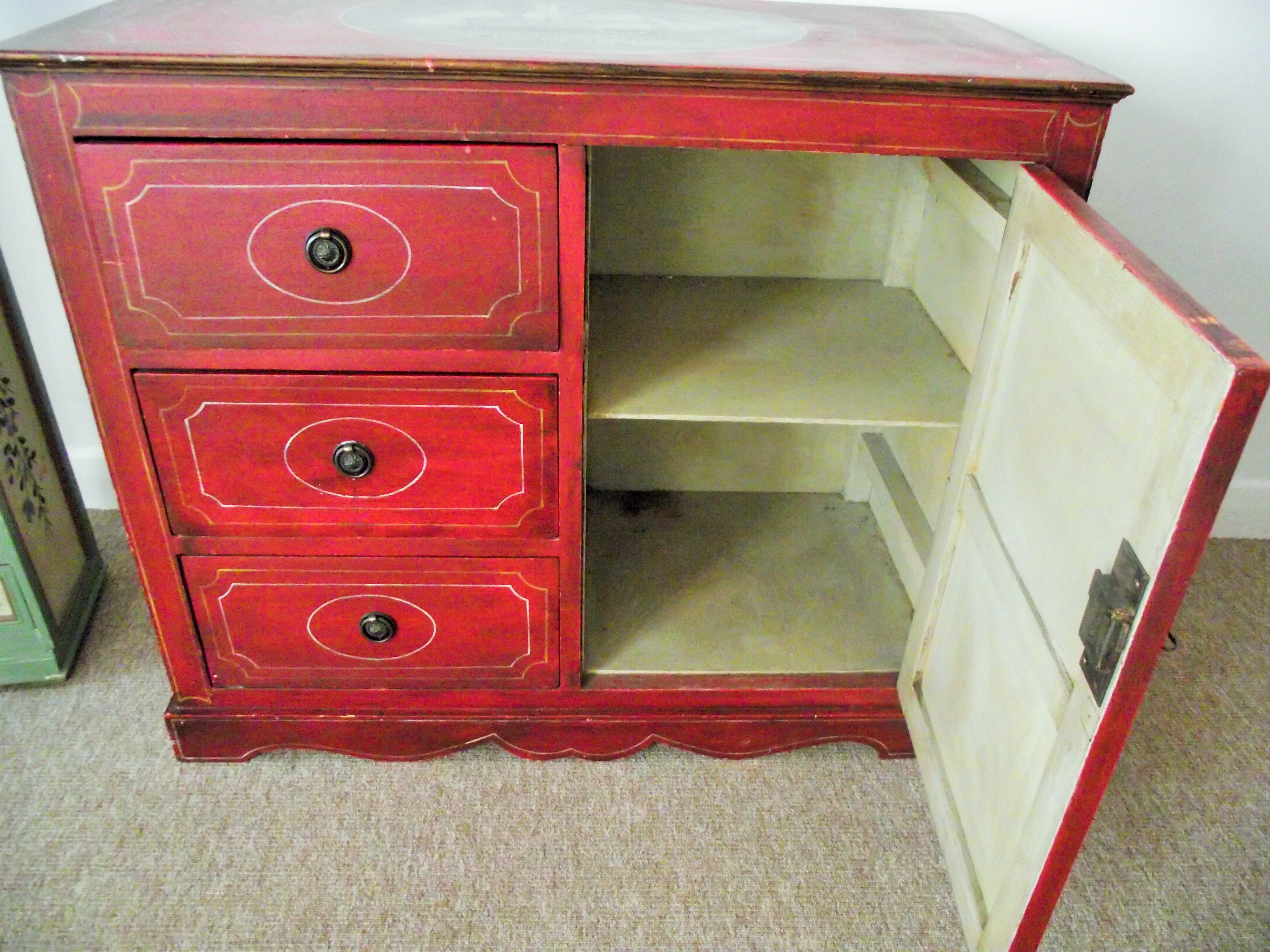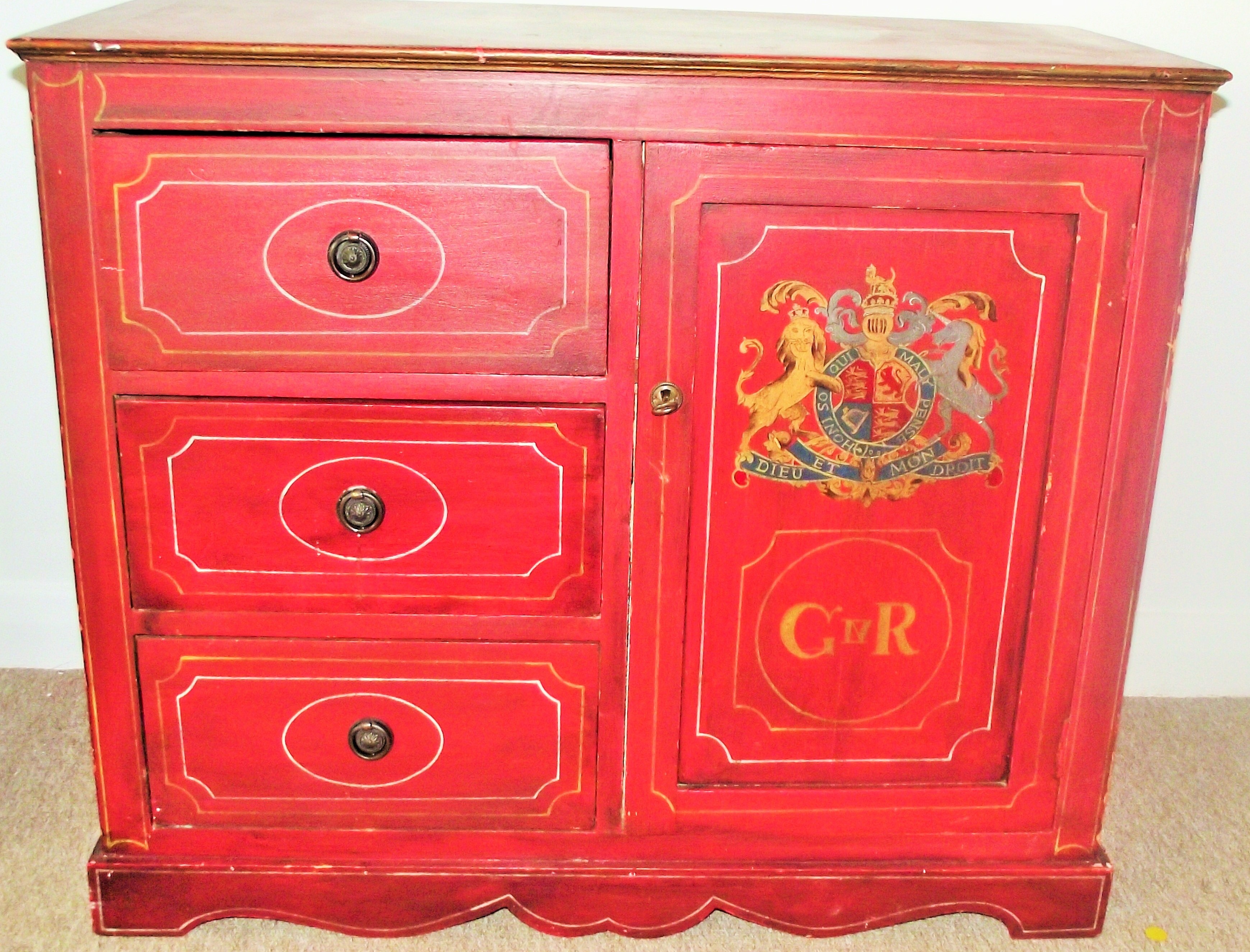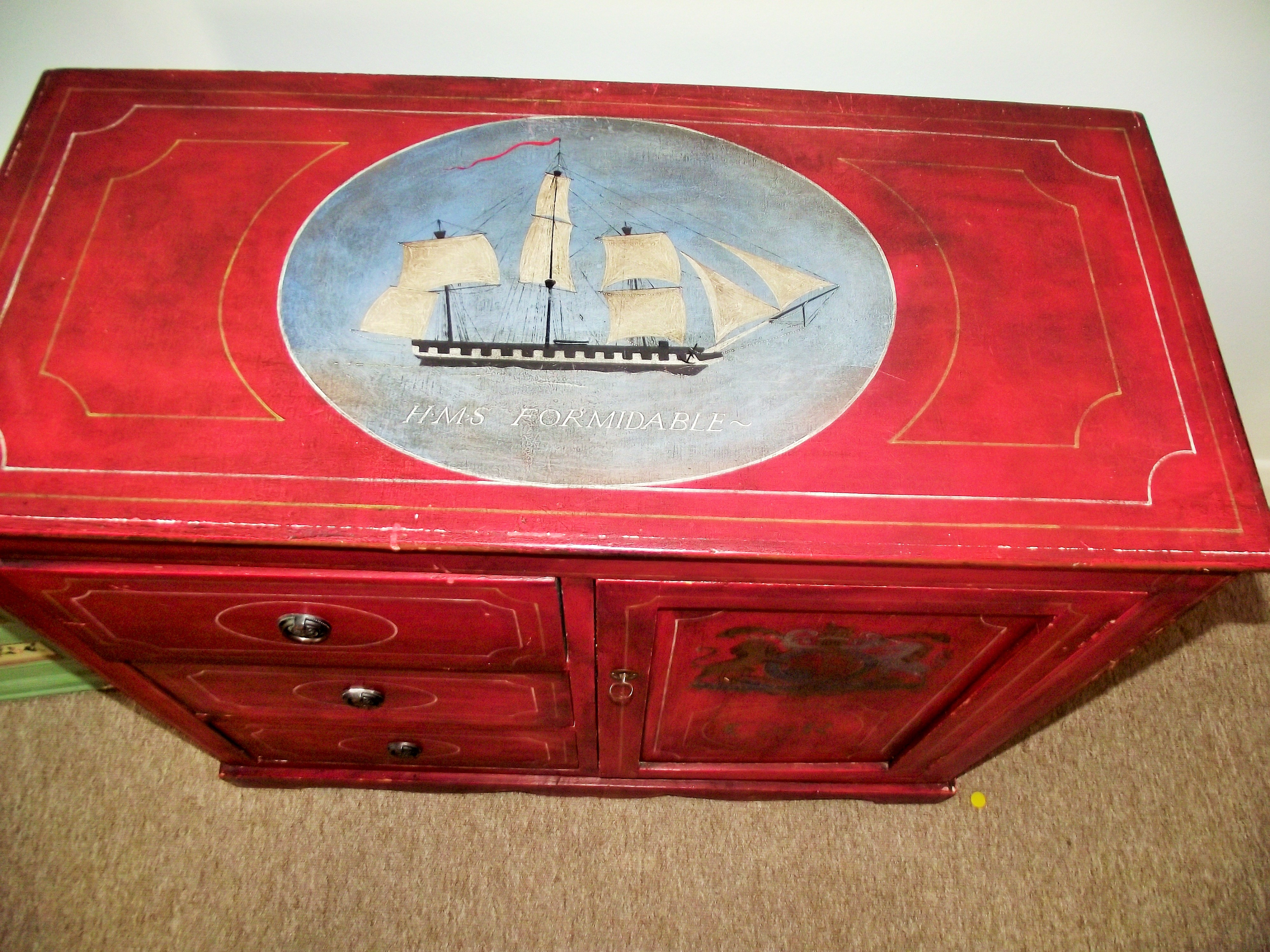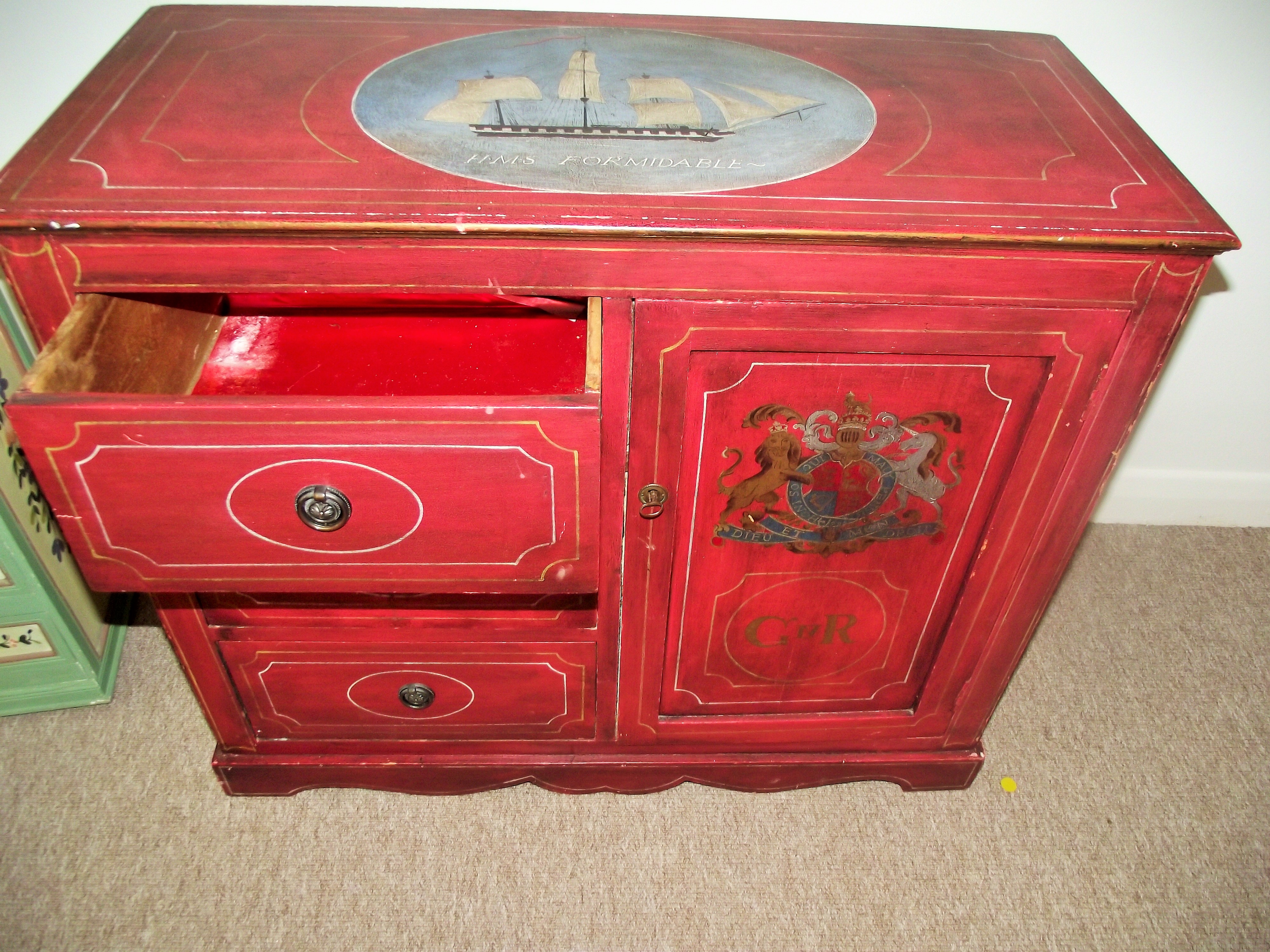 Vintage red painted cupboard with G R royal crest to door and painted picture to top HMS Formidable 34x25x15″ approx