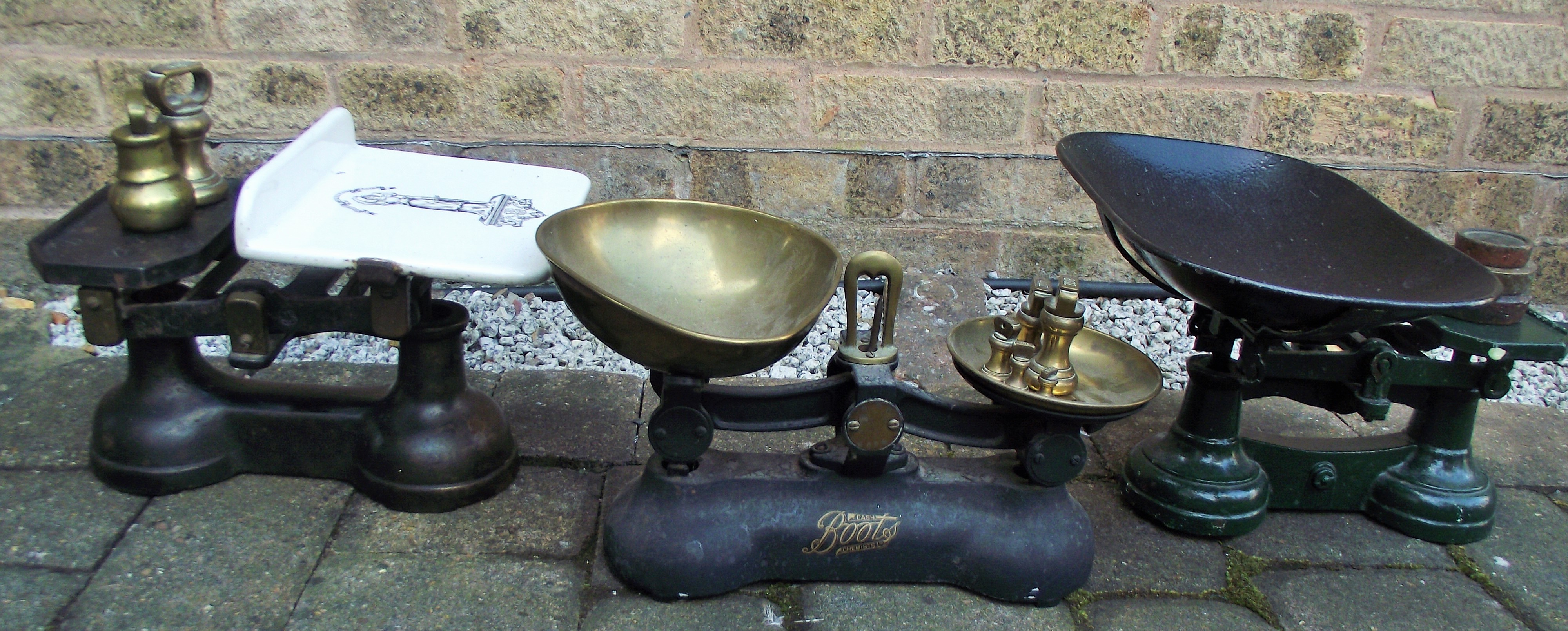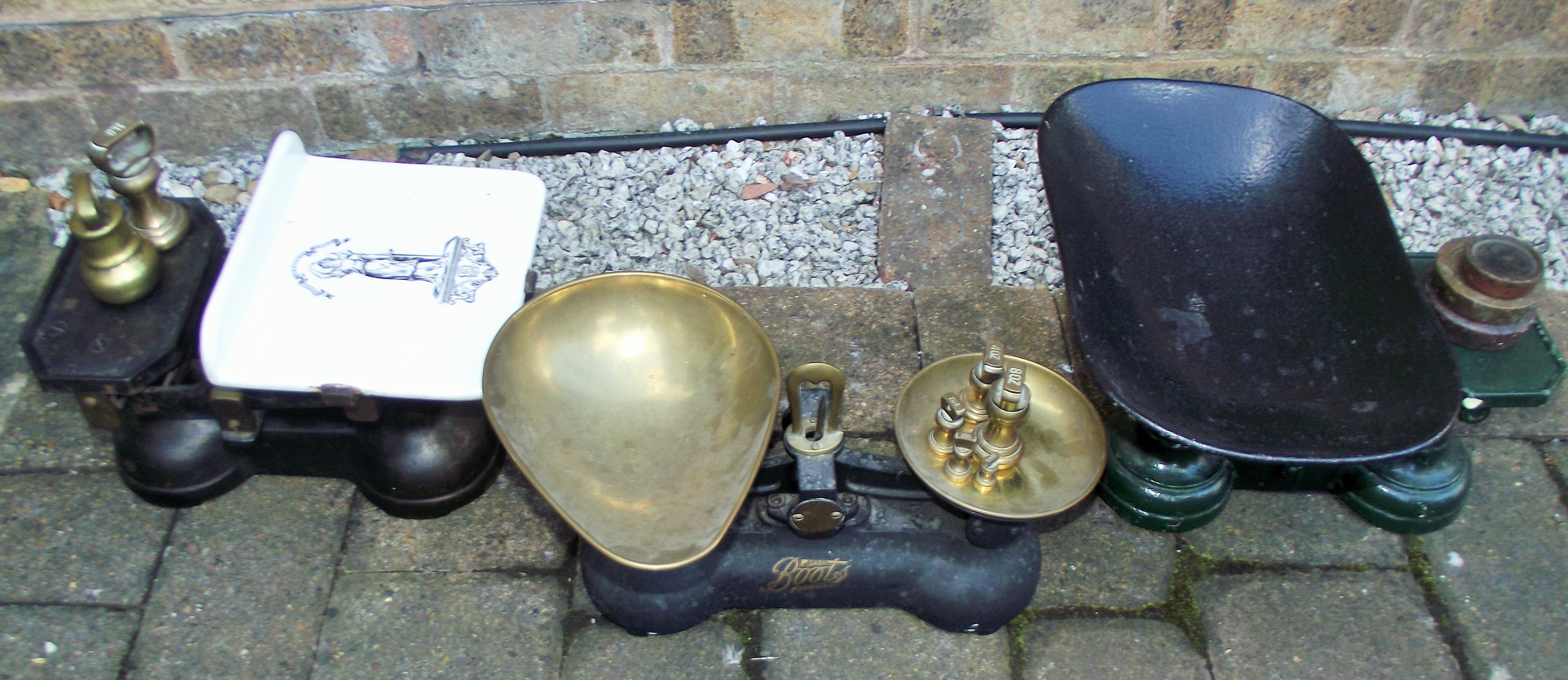 3 sets of weighing scales inc Boots scales , salter & Antique cast iron/ enamel scales Justitia Virtutum Regina with asorted weights