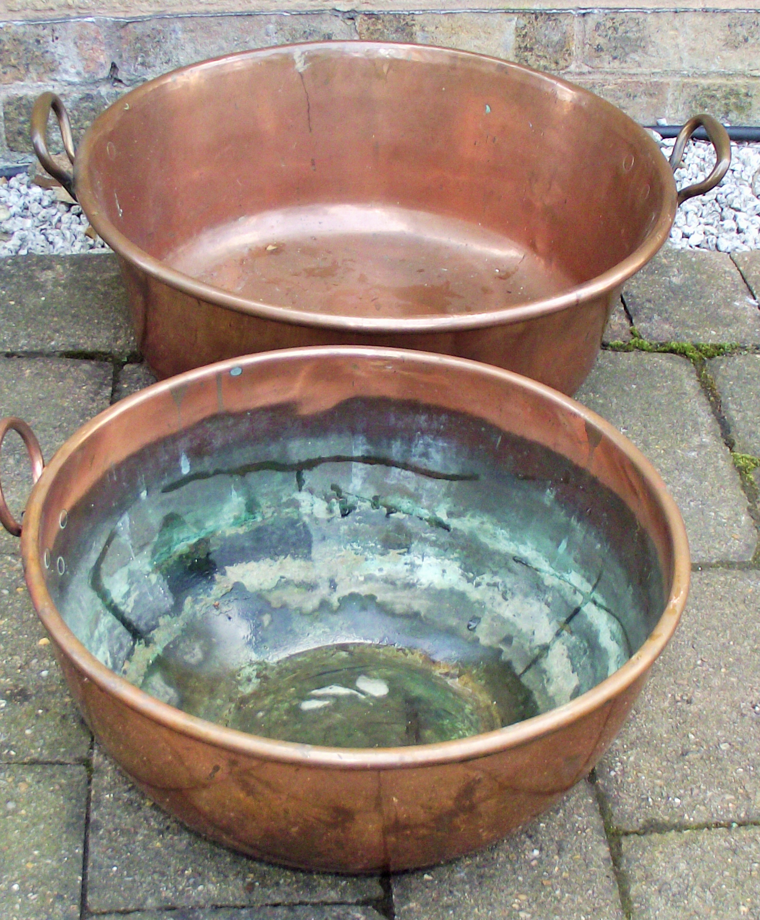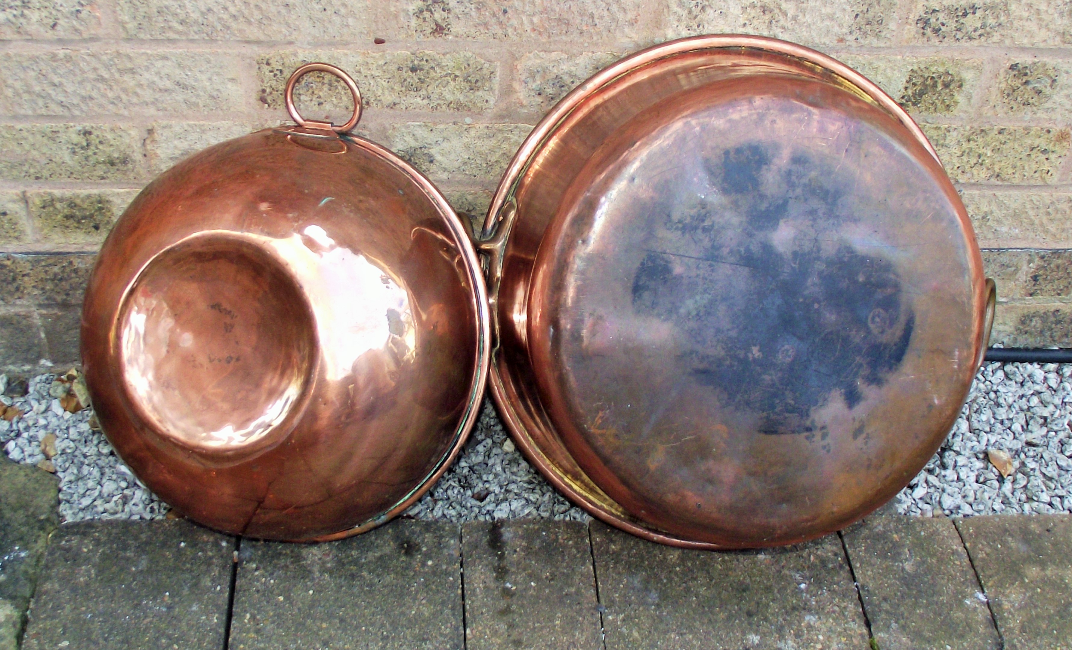 2 very large vintage copper kitchen cooking bowls 18×7″ & 14×7″