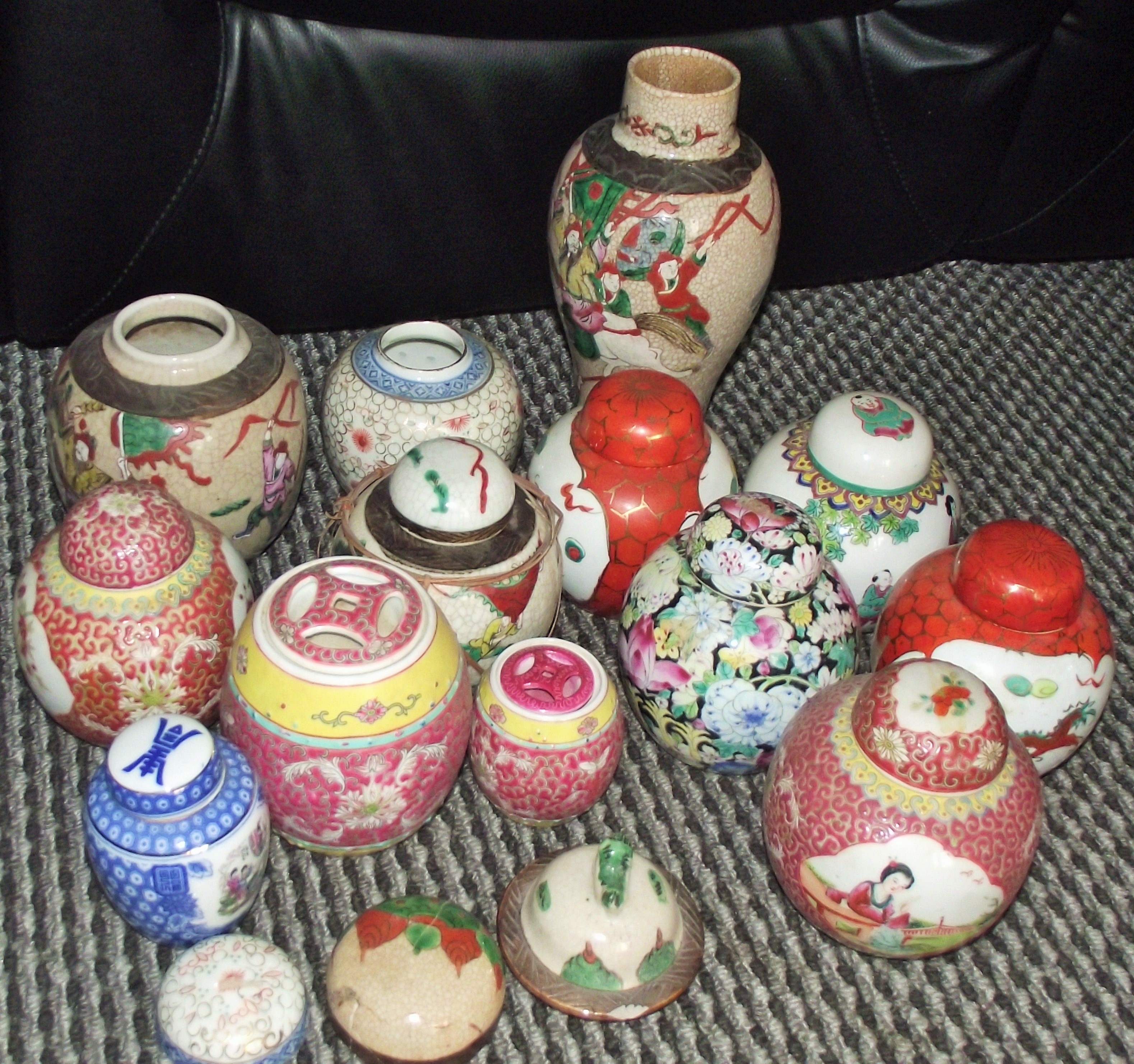 Nice collection of various Ginger jars (3 lids showing at front with slight chips , cracking)