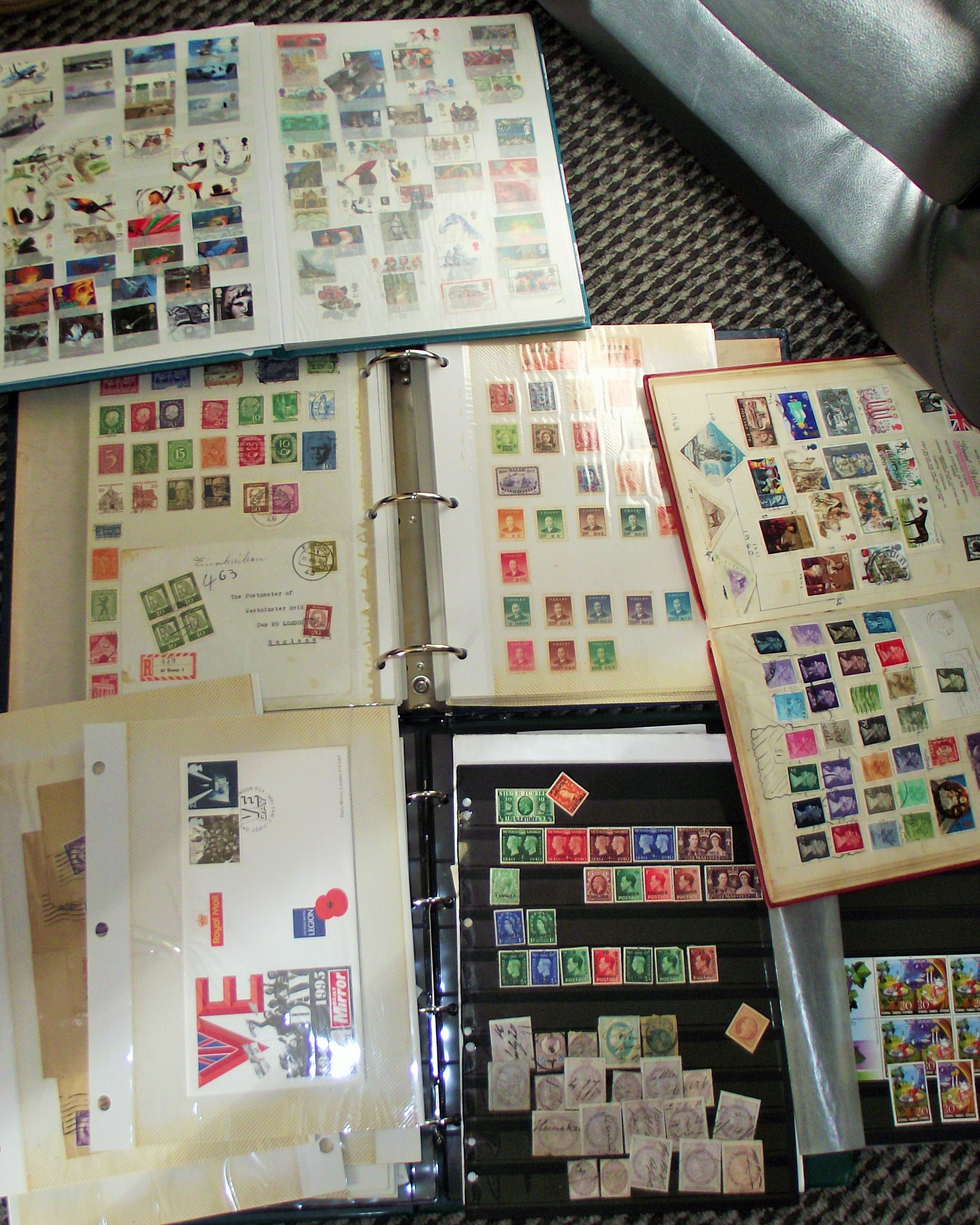 2 good albums of assorted stamps britain british territories and others with a few 1st day covers and envelopes + 2 smaller albums mainly stamps euro96 coronation st etc and assorted others