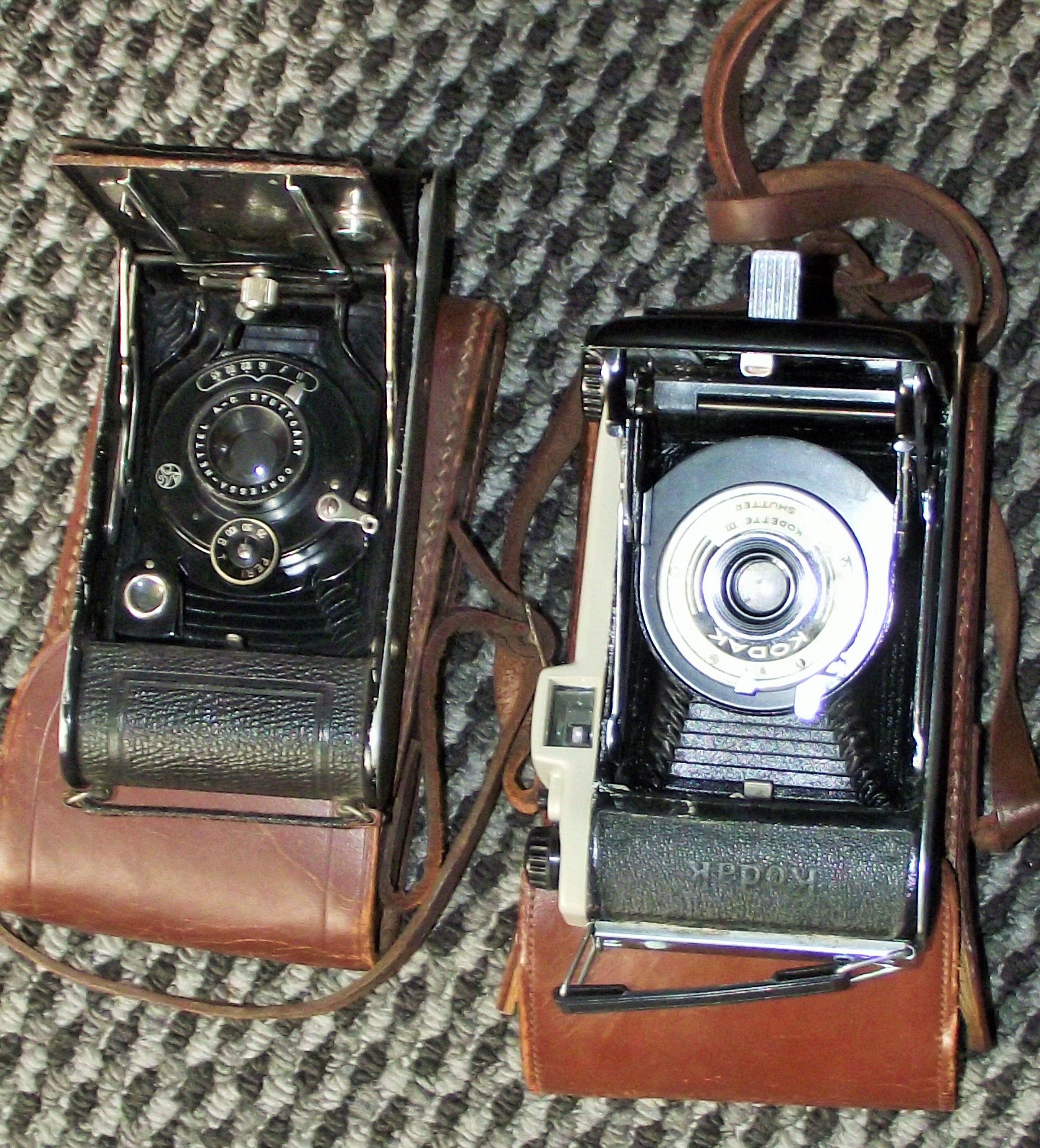 A pair of early to mid-20th-century folding bellows cameras, each presented in its original brown leather half-case with attached straps. The first camera is identified as a Kodak Vigilant Junior Six-20 Folding Camera, an American model featuring a black metal and leatherette body. Its lens assembly is marked “KODAK” and “KODETTE II SHUTTER, ” and it is equipped with a distinctive cream-colored plastic viewfinder. The second camera is a German-made Zeiss Ikon Contessa-Nettel model, with a black metal body and a leatherette covering. Its lens assembly clearly displays “Zeiss Ikon” and “CONTESSA-NETTEL A-G STUTTGART, ” with visible shutter speed settings of “15 25 50 100 200” and “B T”. Both cameras show consistent signs of age but appear to be complete and unrestored.