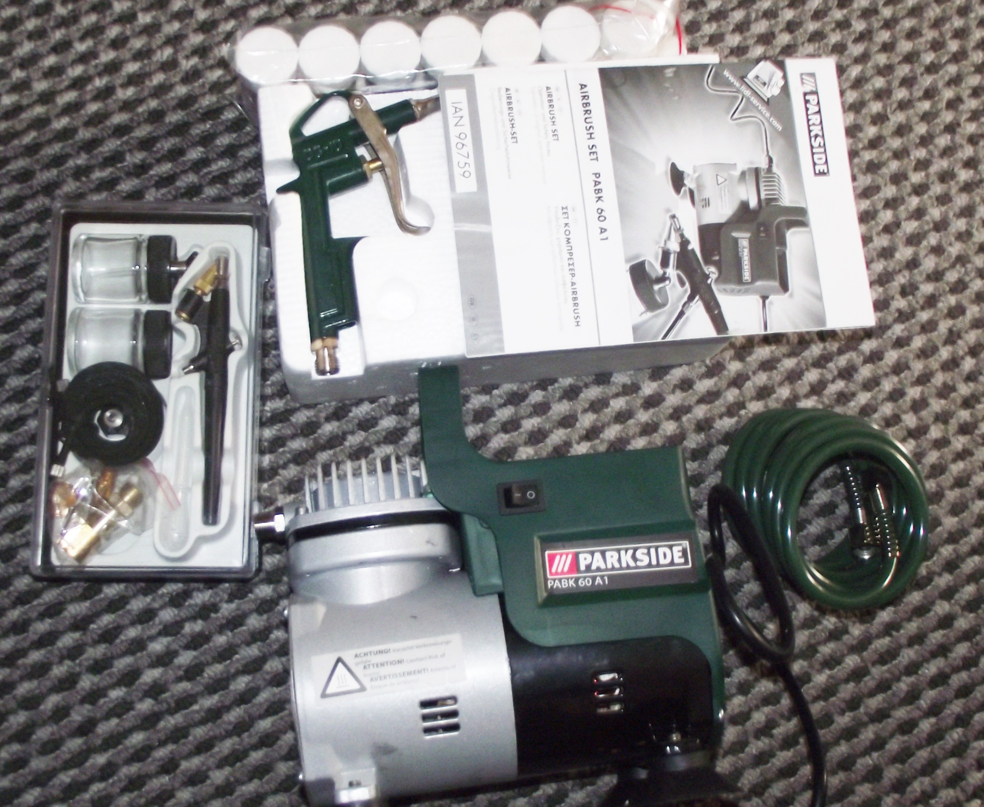 A Parkside PABK 60 A1 Airbrush Set.New in box This modern airbrush set includes a dark green and silver-toned compressor, a primary dark green plastic-handled airbrush gun, a finer metal airbrush, a coiled green air hose, a set of small glass paint jars with black plastic lids, and various metal fittings and nozzles housed in a clear plastic organizer. The original instruction manual is also present. Markings on the compressor and manual identify the model as ‘PARKSIDE PABK 60 A1’, with ‘IAN 96759’ visible on the packaging. Multilingual warnings, including ‘ACHTUNG! Vorsicht!’, ‘ATTENTION! Caution!’, and ‘AVERTISSEMENT!’, are present on the compressor.