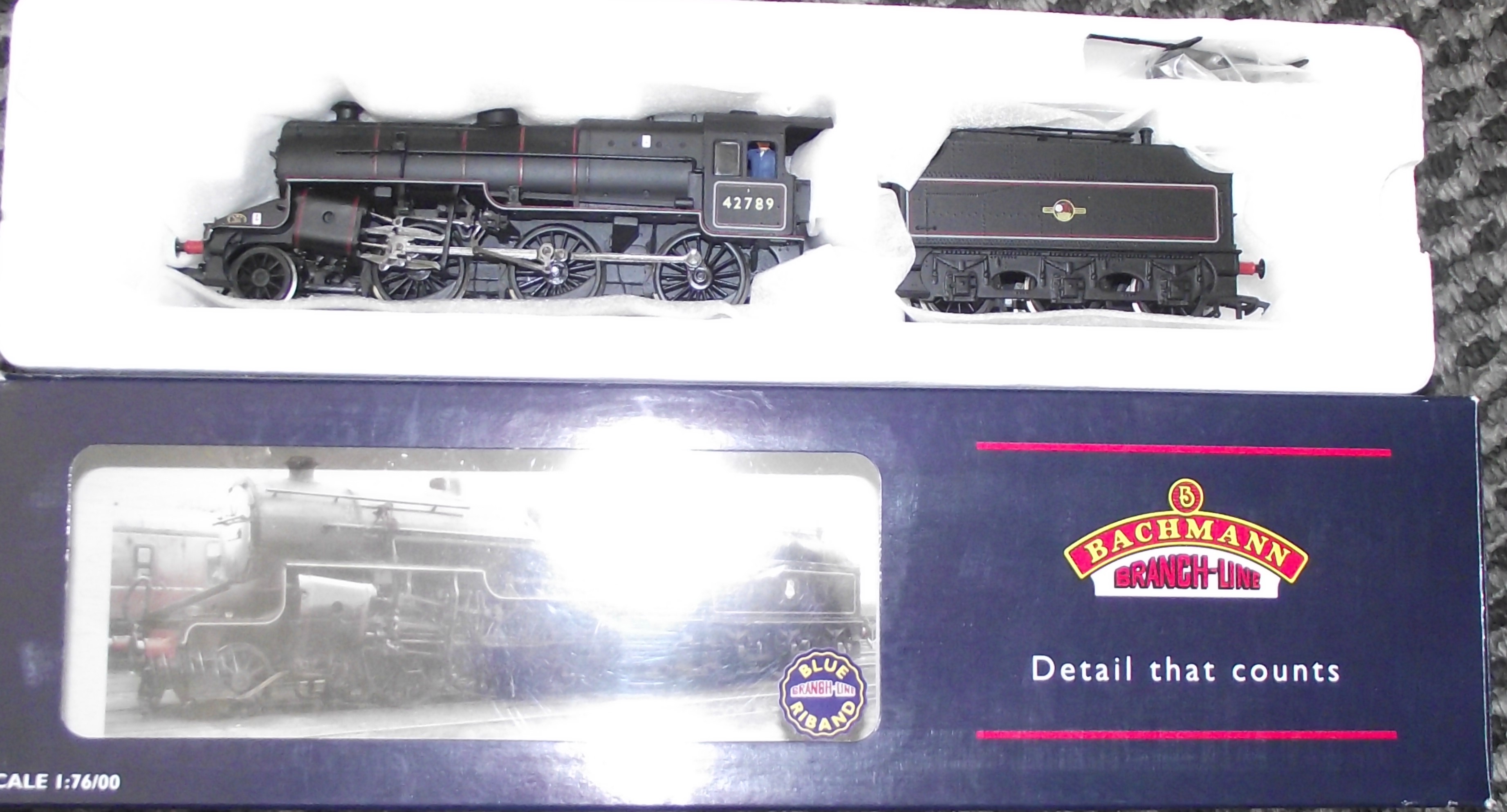 A Bachmann OO Gauge 32-177 2-6-0 Crab Class Locomotive No. 42789, presented in BR Lined Black livery. This model railway locomotive and tender set is constructed from plastic and metal components. The black steam locomotive features red lining and the number ‘42789’ on its cab. The matching tender displays a circular crest-like emblem. The item is presented in its original manufacturer’s dark blue cardboard box with a clear window, containing a fitted white polystyrene insert. The box is marked ‘BACHMANN BRANCH-LINE, ‘ ‘SCALE 1:76/00,’ and ‘BLUE RIBAND, ‘ with the slogan ‘Detail that counts.’