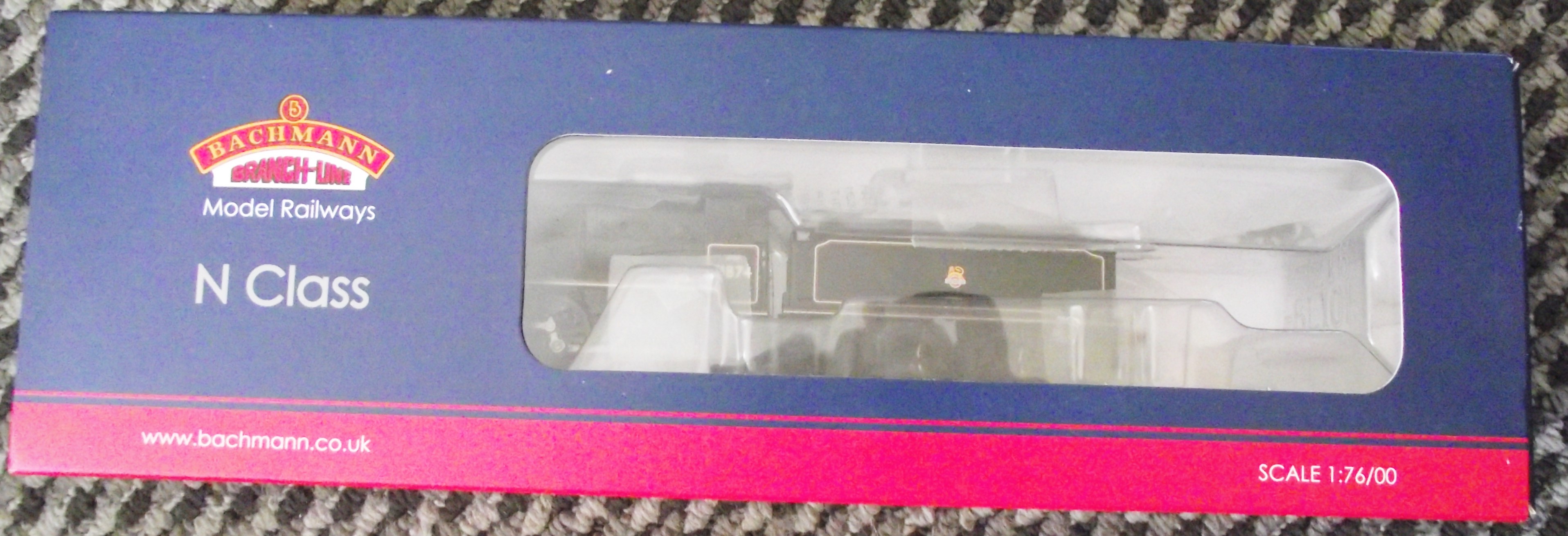 A Bachmann Branchline Class N 2-6-0 model railway locomotive, numbered 31874 and presented in BR lined livery. The locomotive is housed in its original, sealed blue and red cardboard retail packaging, which features a clear plastic window. The box is branded ‘BACHMANN BRANCH-LINE Model Railways’ and clearly states ‘N Class’, ‘www.bachmann.co.uk’, and ‘SCALE 1:76/00’. The dark-colored locomotive inside displays visible gold accents and a crest, and is securely held within a clear plastic insert.