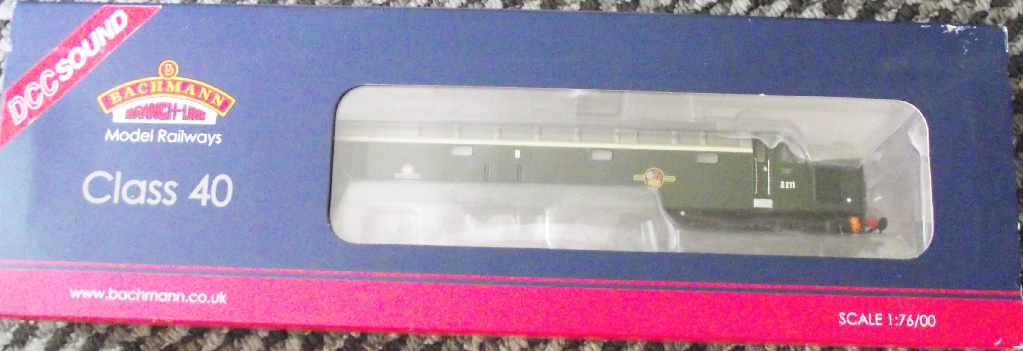 A Bachmann Branch-Line OO Gauge model railway locomotive, identified as reference 32-480DS, a Class 40 diesel engine numbered D211 and known as ‘Mauritania’. The model features DCC Sound capabilities. It is presented in its original dark blue cardboard packaging with a clear plastic window, bearing “Model Railways” branding and “SCALE 1:76/00” indication. The locomotive is finished in a dark green livery with a cream/yellow stripe below the roofline and a round British Rail emblem visible on its side.