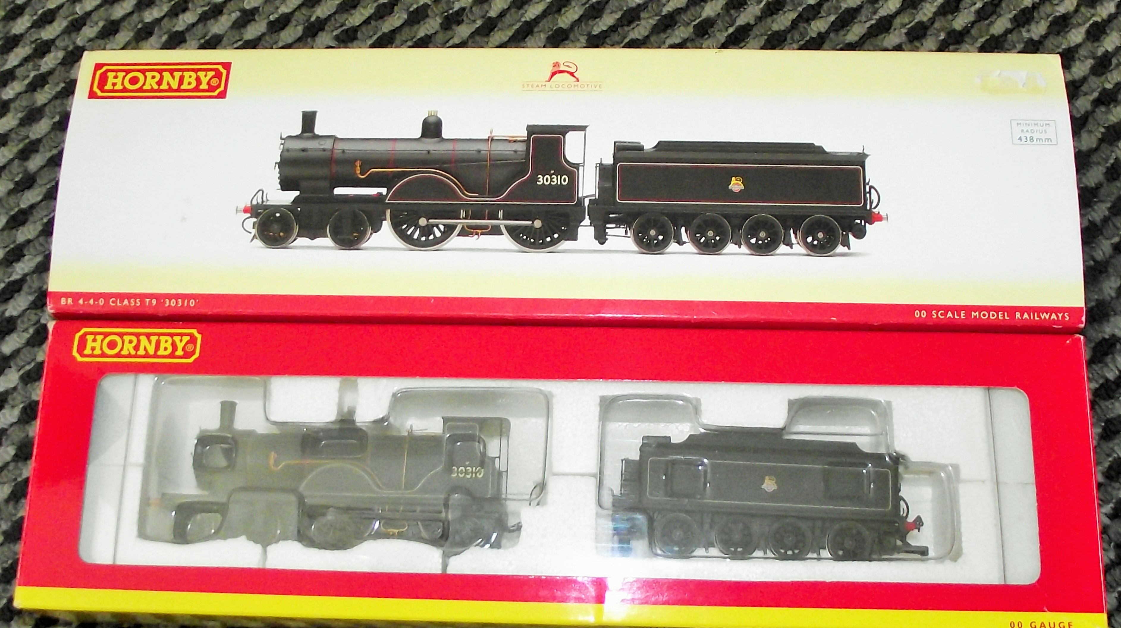 A Hornby OO Gauge BR 4-4-0 Class T9 ‘30310’ Steam Locomotive and Tender, model reference R2713. The model is presented in British Railways (BR) lined black livery. It is housed in its original manufacturer’s packaging, which comprises an outer cardboard box depicting the locomotive and an inner box with clear plastic inserts securely holding the locomotive and tender components. The packaging is branded ‘HORNBY’ and clearly states ‘BR 4-4-0 CLASS T9 ‘30310”, ’00 SCALE MODEL RAILWAYS’, and ‘MINIMUM RADIUS 438mm’. The model itself, constructed from plastic and die-cast metal, appears to be in excellent, unused condition.