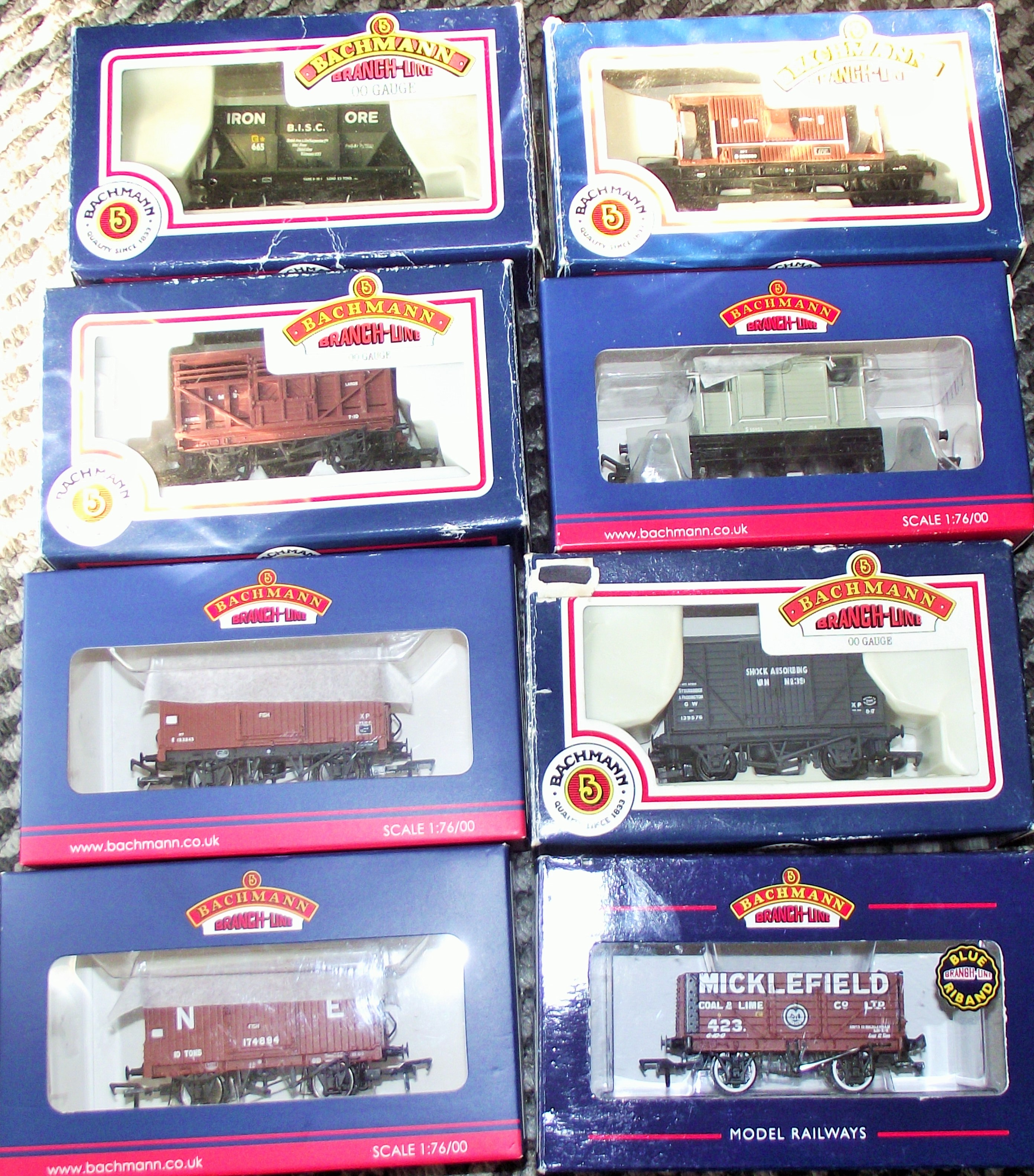 A collection of eight Bachmann ‘Branch-Line’ OO Gauge model railway freight wagons. Each wagon is presented in its original blue and red windowed cardboard packaging, clearly marked ‘SCALE 1:76/00’ and ‘OO GAUGE’. The models are constructed from plastic and metal, depicting various types of rolling stock. Specific wagons include an ‘IRON ORE B.I.S.C.’ wagon, a ‘MICKLEFIELD COAL & LIME’ wagon, a ‘SHOCK ABSORBING’ van, and a ‘FISH’ wagon, alongside general purpose variants. Visible numbers include ‘665,’ ‘174884,’ and ‘423.’ Branding on the packaging includes the ‘BACHMANN’ logo with ‘Quality Since 1833’ and a ‘BLUE RIBAND’ mark on one box.
