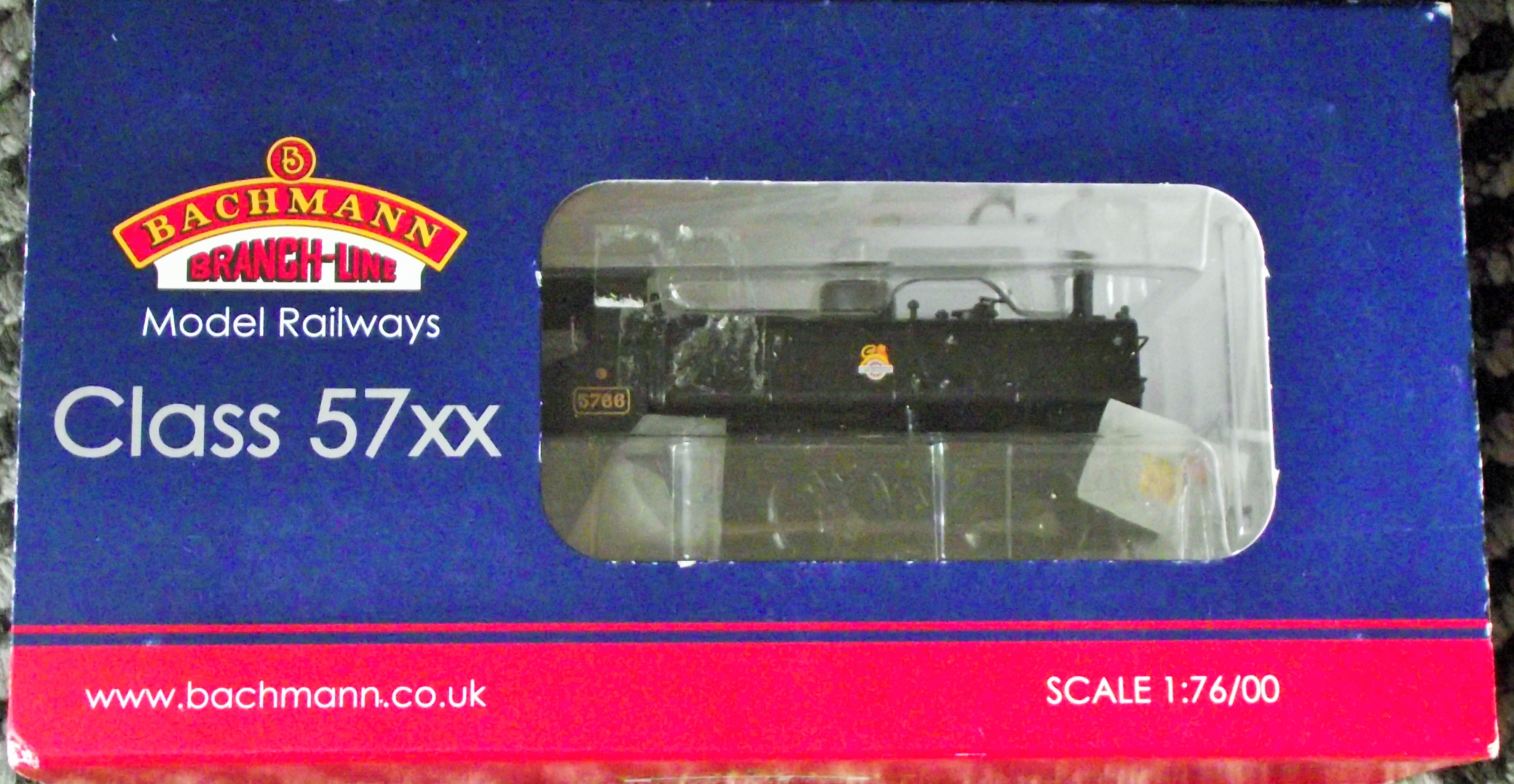 A Bachmann Branch-Line OO Gauge Class 57xx Pannier Tank Locomotive, model reference 32-214, depicting locomotive number 5766 in BR Black livery. The model is constructed from plastic and metal components and is presented in its original dark blue and red cardboard packaging. The packaging features a clear plastic window displaying the black-colored model. Visible markings on the packaging include ‘BACHMANN BRANCH-LINE Model Railways, ‘ ‘Class 57xx, ‘ ‘www.bachmann.co.uk, ‘ and ‘SCALE 1:76/00.’