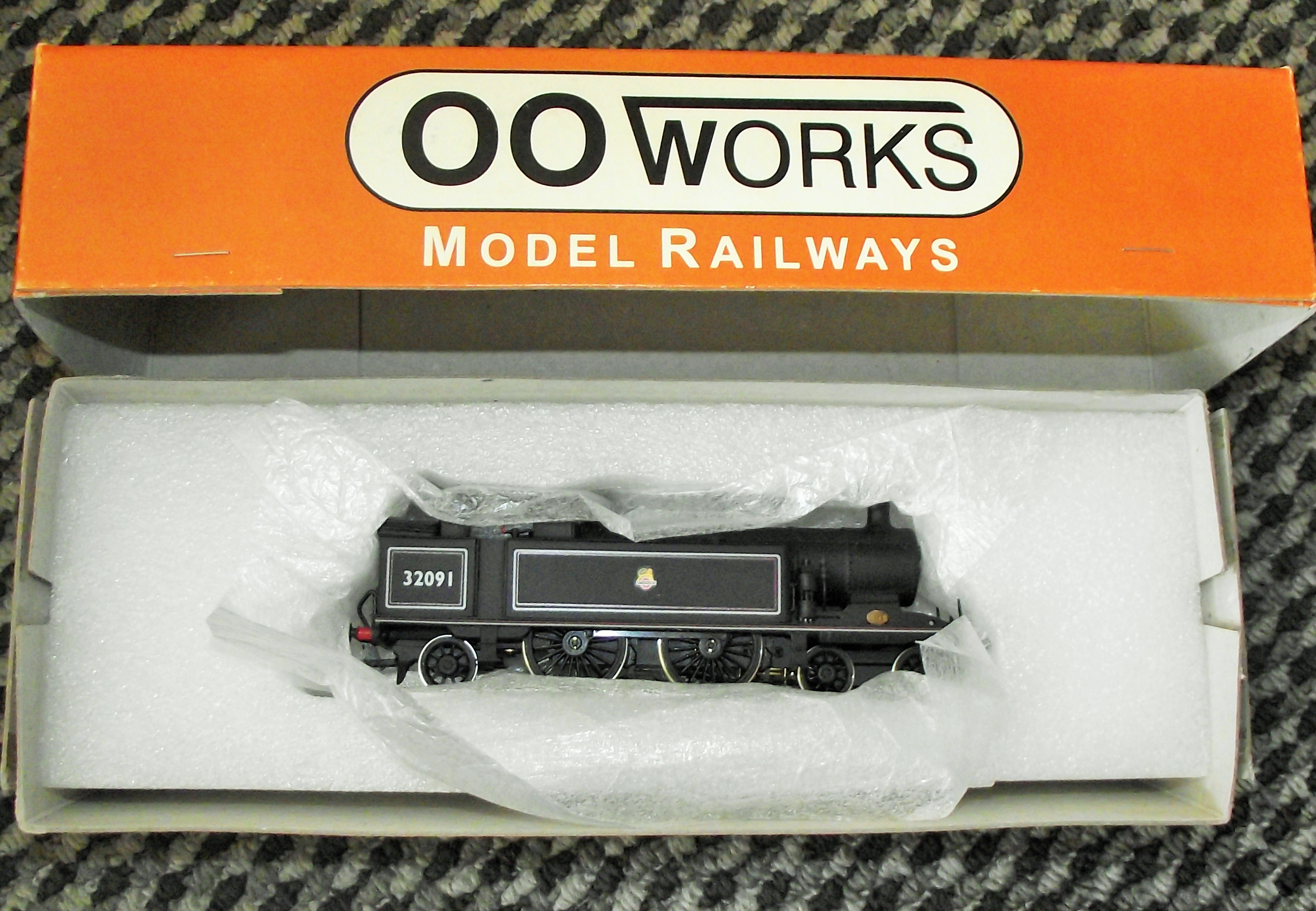 An OO Works 4-4-2 ex LB&SCR/SR BR Black Class I3 Marsh Tank steam locomotive, numbered 32091. The model is predominantly black with silver wheels and detailing, featuring the numerical marking “32091” on a black rectangular panel on its side. A small, colorful crest is visible on the boiler section. The locomotive is presented in its original orange cardboard box, which is clearly marked with “OO WORKS MODEL RAILWAYS” in a distinctive white oval logo. The model is securely housed within a white polystyrene insert and protected by clear bubble wrap.