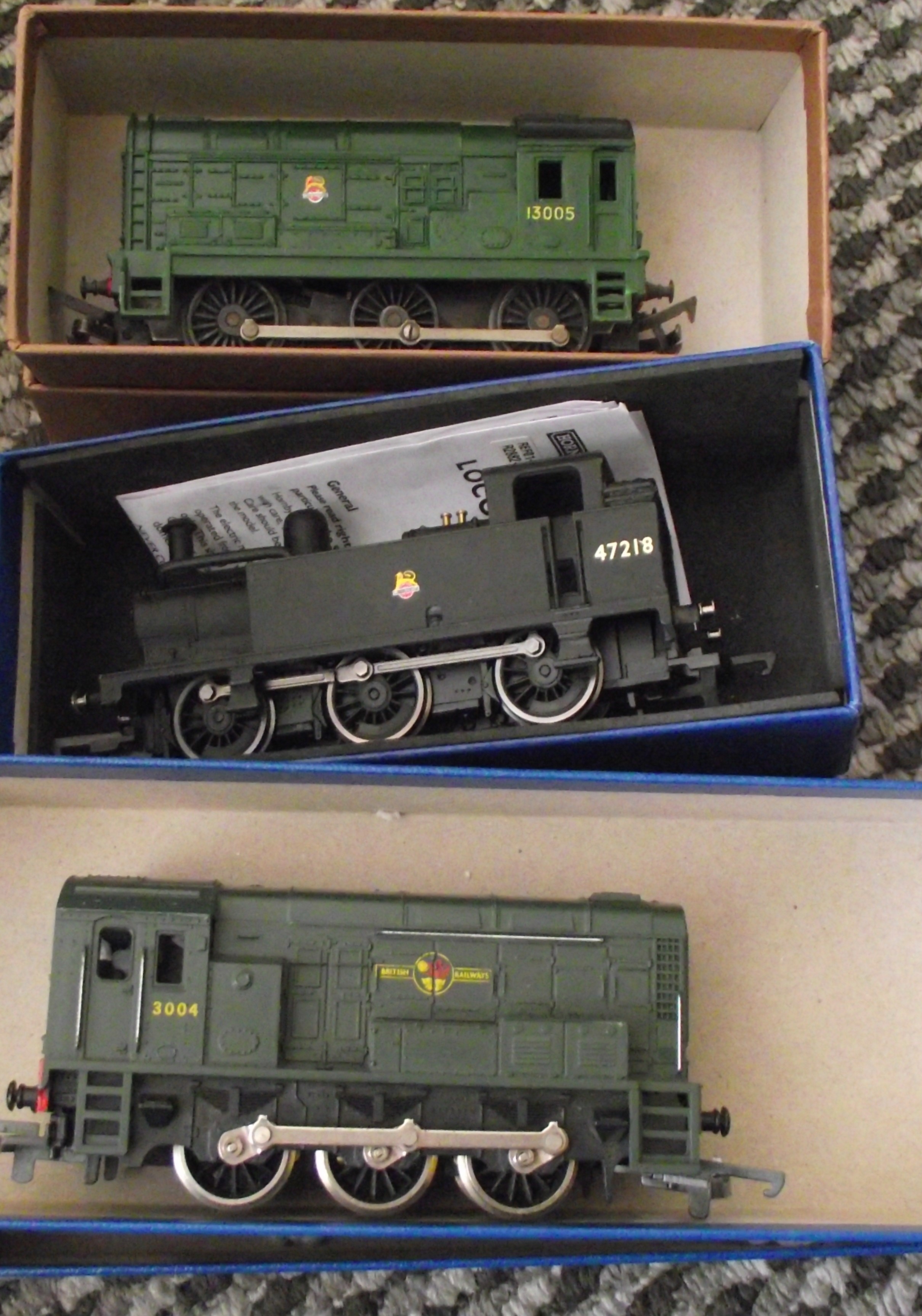 A group of three Hornby OO gauge model railway locomotives, all presented in British Railways green livery. The collection includes a diesel or electric locomotive, numbered “13005”, featuring a small crest; a tank engine or steam locomotive, numbered “47218”, also bearing a similar crest, and accompanied by a partially visible Hornby instruction leaflet; and a second diesel or electric locomotive, numbered “3004”, distinguished by a yellow and red “BRITISH RAILWAYS” logo. All three models are constructed from plastic or die-cast metal, featuring visible wheel mechanisms.