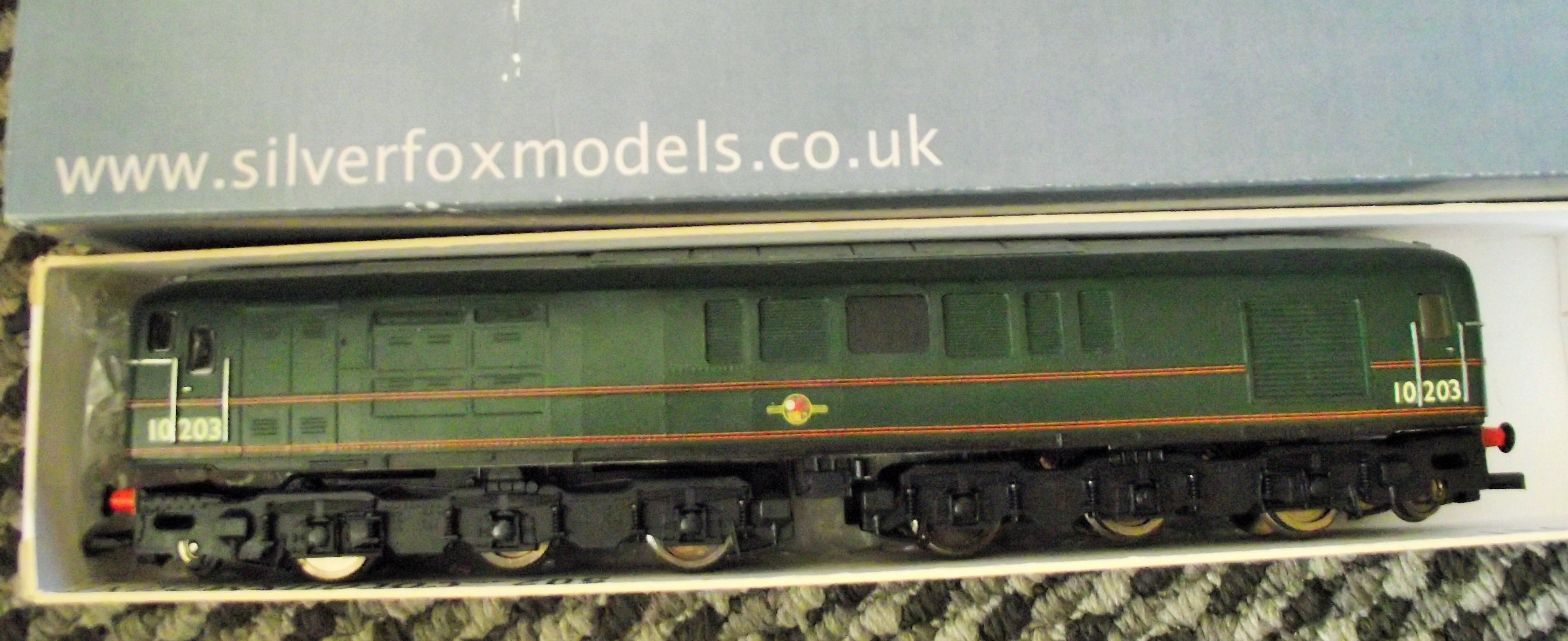 This model diesel locomotive is identified as a Silver Fox Bulleid 1-Co-Co-1 Class D16/2, bearing the number 10203. It features a dark green livery, characteristic of early British diesel locomotives, with “10203” displayed prominently on both ends. A small circular red and yellow emblem is centrally located on the side, flanked by two thin red/orange horizontal stripes. The model is constructed from plastic and metal. The visible packaging is marked with the website address “www.silverfoxmodels.co.uk”.