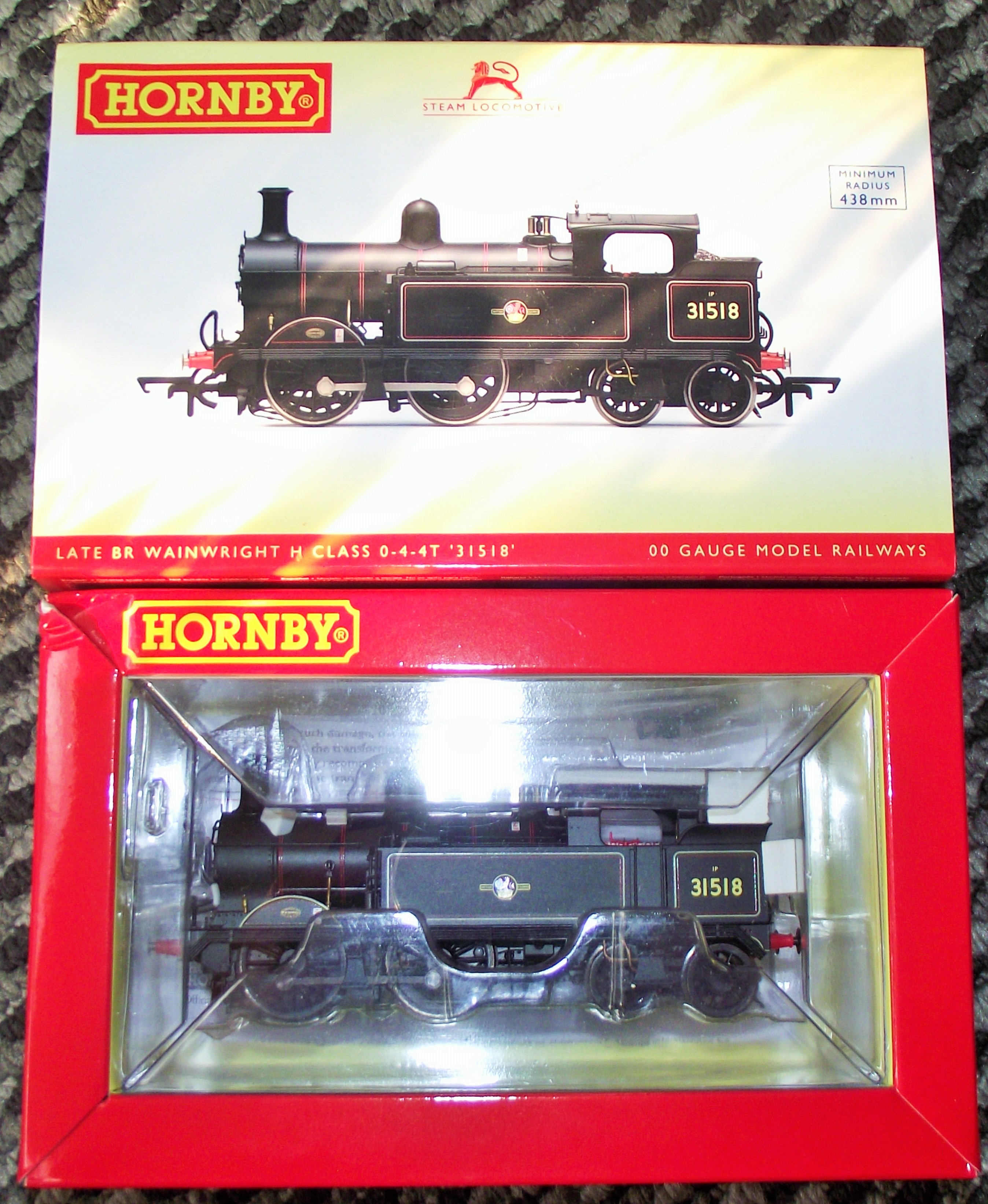 A Hornby R3539 OO Gauge BR Wainwright H Class 0-4-4T No.31518 steam locomotive, presented in BR Lined Black Late Crest livery. The model is sealed within its original red-bordered cardboard box, which features a clear plastic window. The packaging displays the Hornby logo with a registered trademark symbol, a ‘Steam Locomotive’ designation with a lion emblem, and a ‘Minimum Radius 438mm’ specification. The locomotive bears the number ‘31518’ on its side.
