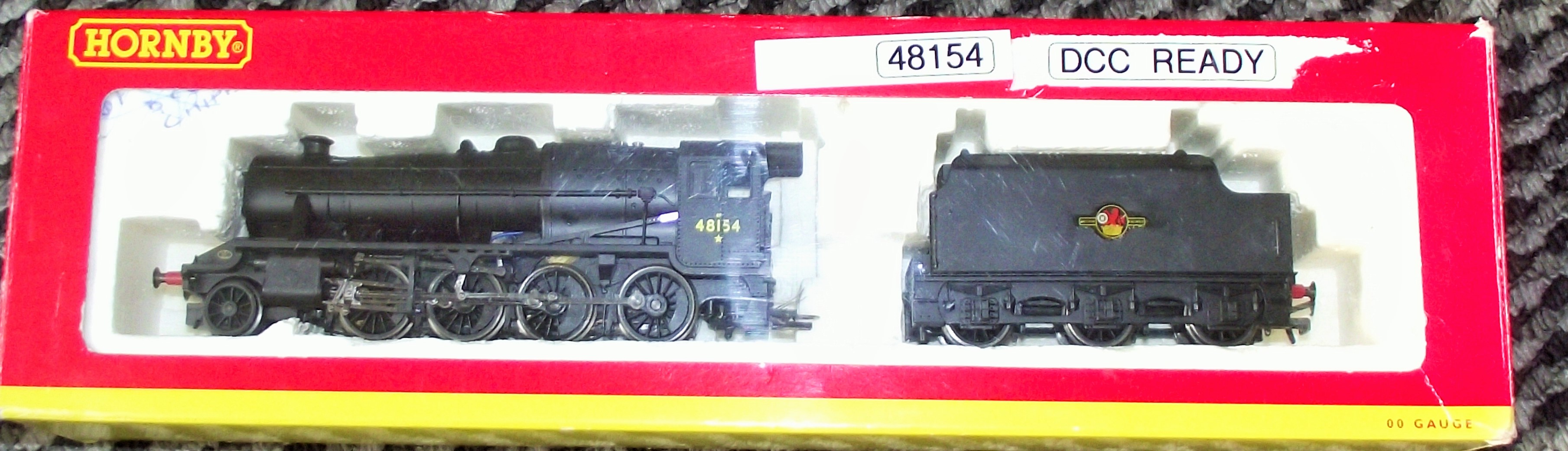 A Hornby OO Gauge BR Stanier Class 8F 2-8-0 steam locomotive, numbered 48154, with its separate tender. The black locomotive features the number ‘48154’ and a star marking on its cab. The tender displays a circular red, yellow, and black emblem. The model is presented in its original red and yellow branded cardboard box, marked ‘HORNBY®’, ‘48154’, ‘DCC READY’, and ’00 GAUGE’. It is housed securely within a clear plastic vacuum-formed insert.