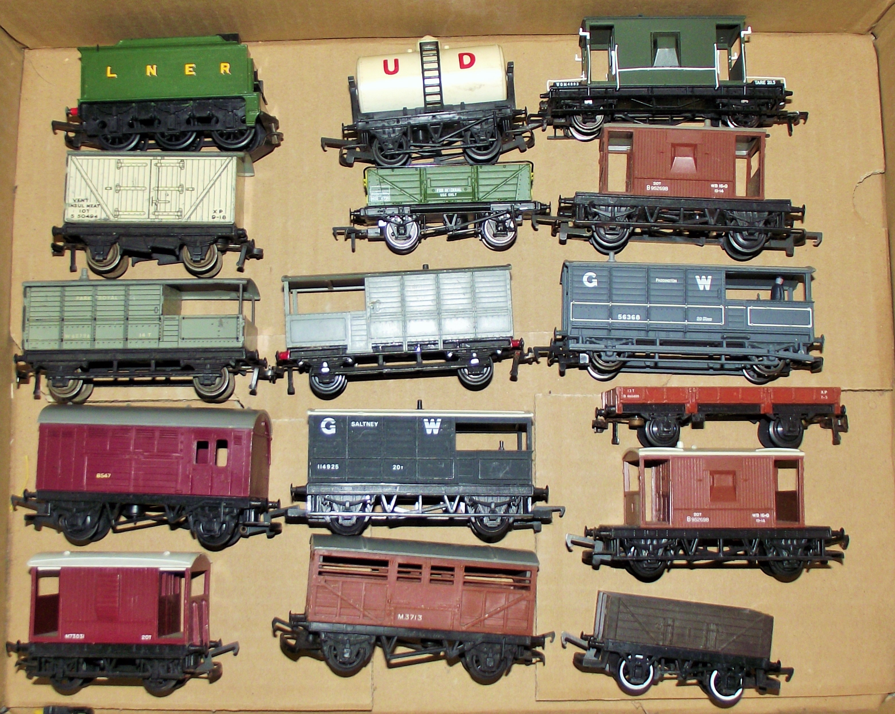 A collection of approximately eighteen Tri-ang Hornby OO gauge model railway rolling stock items, primarily comprising freight wagons and a single locomotive cab. Constructed from plastic with metal wheels and couplings, these models represent various British railway companies including London and North Eastern Railway (LNER), Great Western Railway (GWR), and Southern Railway, indicated by visible markings such as “S 50494” on a “VENT INSUL MEAT” van. Other visible text includes “UD” on a tanker, “INTERNAL USE ONLY” on a dark green van, “PARK ROYAL, ” “PADDINGTON, ” and “SALTNEY” (locations), “XP” (a wagon classification), and various wagon numbers and capacities (e.g., “10T”, “14 T”, “20T”). The collection encompasses a range of British freight and passenger rolling stock styles, likely dating from the mid-20th century.