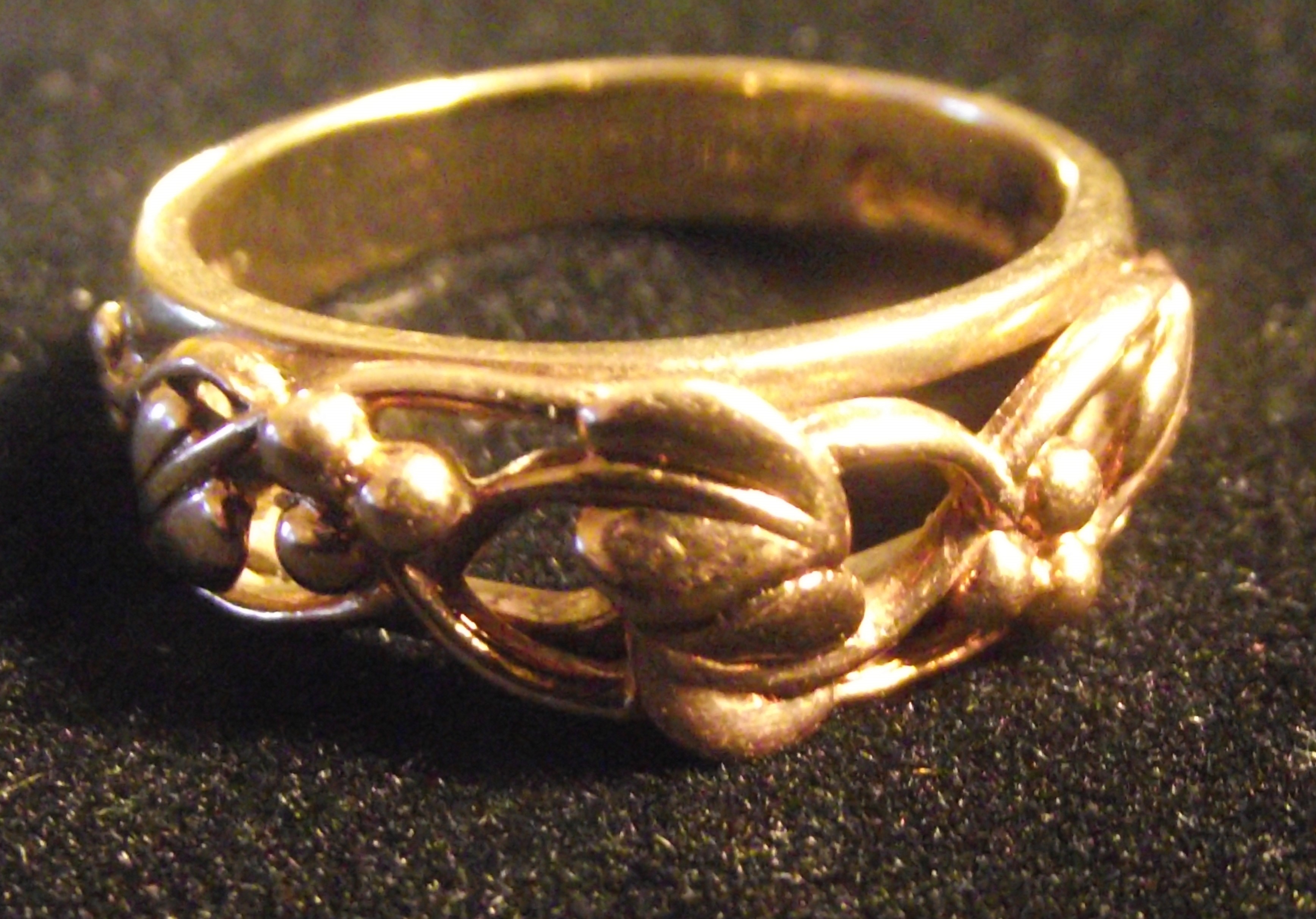 A 9ct gold fully marked Clogau Welsh Gold ‘Tree of Life’ ring, 5.75g approx a decorative finger ring crafted from a yellow-toned metal with a polished finish. Its design features an openwork band adorned with intertwined foliate or scroll motifs, accented by small, rounded, bead-like elements, suggesting an organic, naturalistic style. No discernible text, hallmarks, or maker’s marks are visible on either the interior or exterior surfaces.