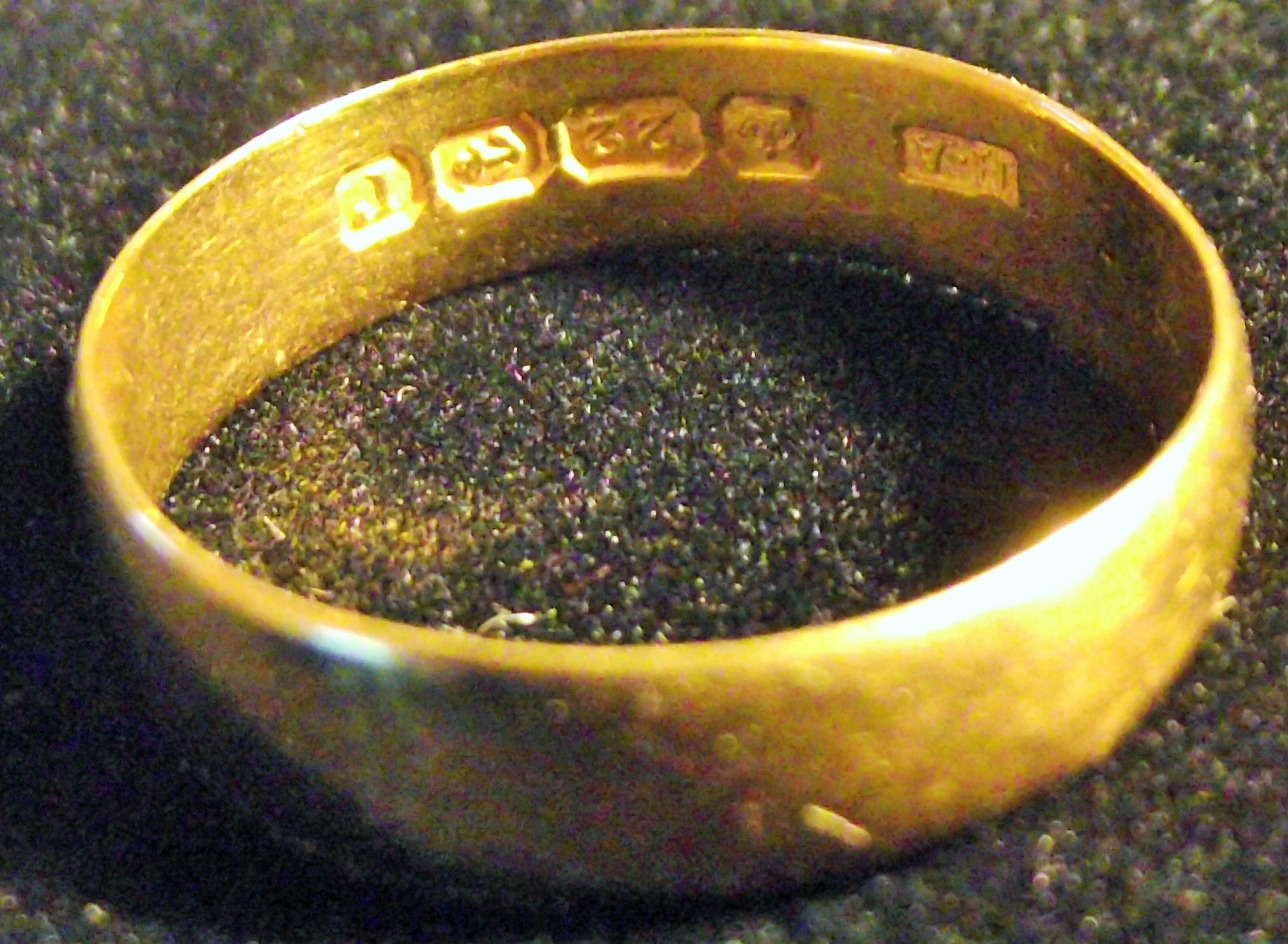 An Edwardian 22 Carat Gold Wedding Band. 3.6g approx This plain, yellow metal band-style ring features visible hallmarks on its interior surface, including the numeral ’22’ and a crown, confirming its 22 carat gold composition. The anchor symbol identifies the Birmingham Assay Office, alongside a single letter mark (possibly ‘J’ or ‘I’) denoting the production year, and an unidentifiable maker’s mark (e.g., ‘M.G.’ or ‘W.G.’).