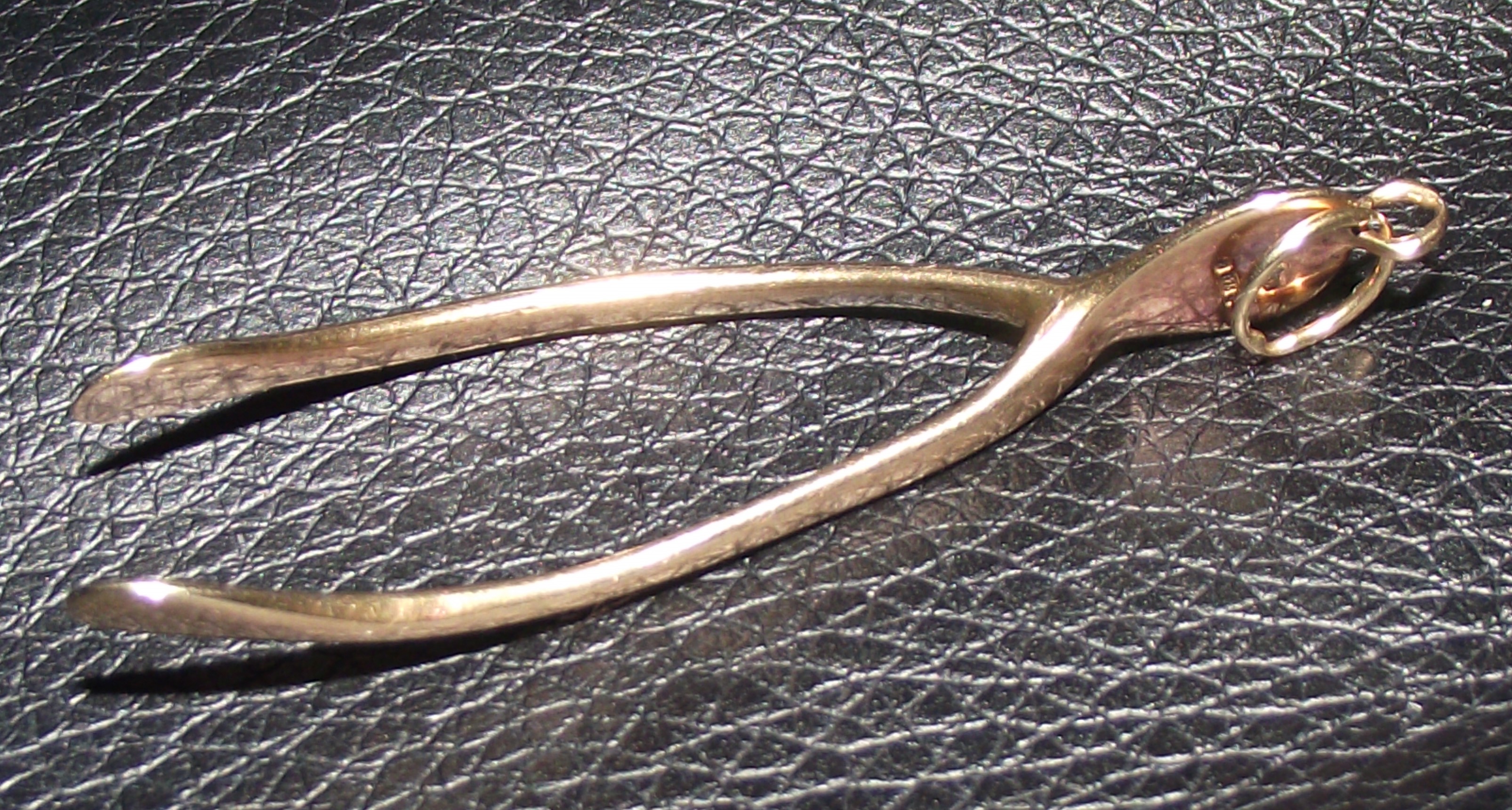 This item is a 9ct fully marked wishbone-shaped charm or pendant, crafted from a yellowish-gold toned metal. It features a simple, unadorned design, typical of good luck or novelty jewelry. A small jump ring is attached at the apex, indicating it is intended for suspension. No discernible text, hallmarks, or distinctive stylistic elements are visible to determine a specific period or maker.