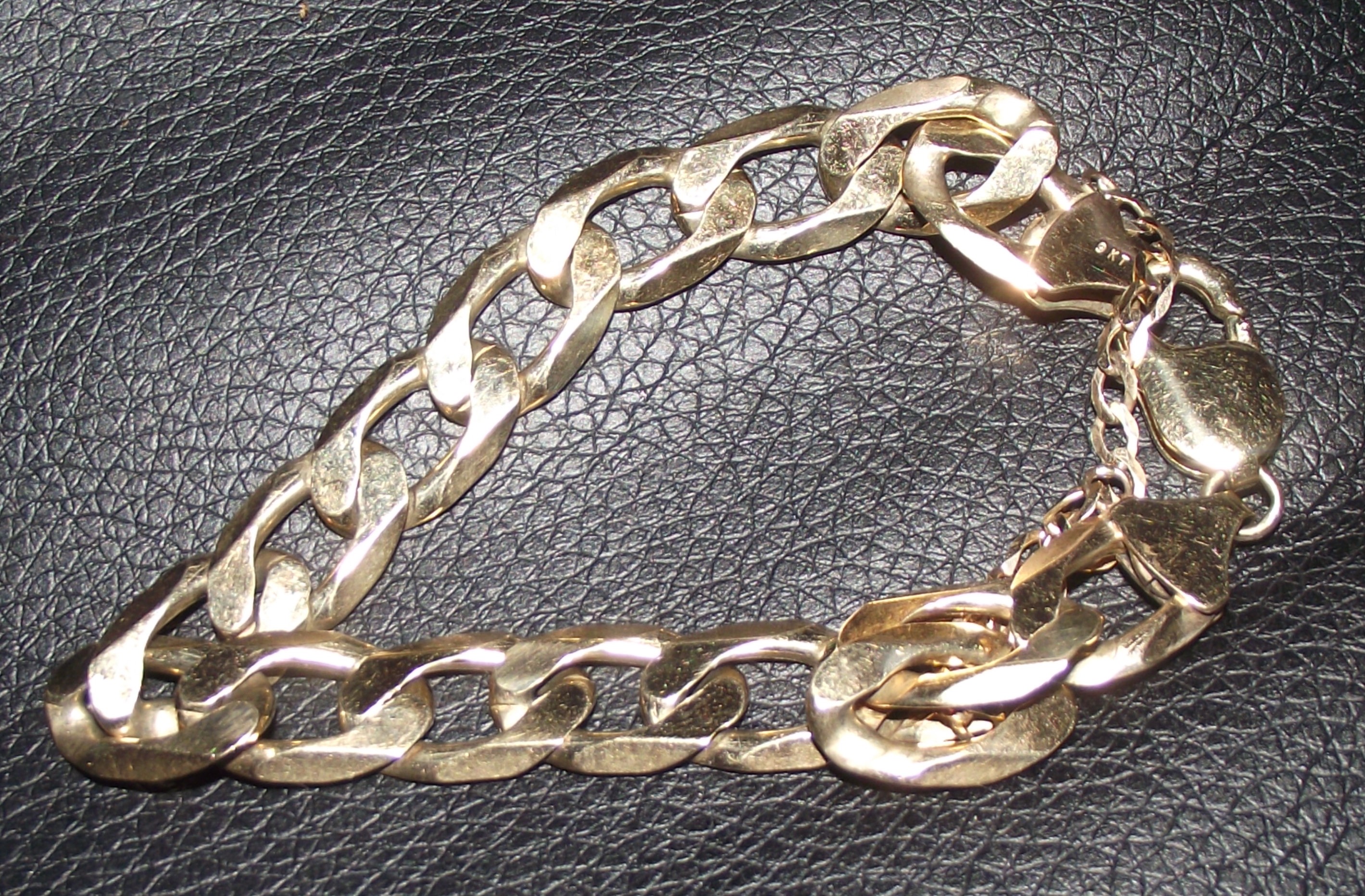 A heavy 26.4g approx 9K gold fully marked curb link bracelet, composed of substantial, flattened interlocking links. A ‘9KT’ hallmark is clearly visible on the lobster claw clasp.